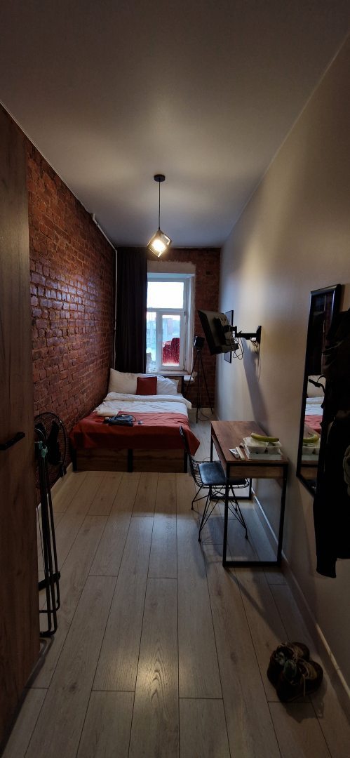 За такую цену очень неплохо, всё необходимое есть, тихо, ночью вообще очень комфортно. Постельное чистое, ну уборку конечно нужно делать качественно. Но благо есть одноразовые тапочки. Достаточно розеток и удлинитель, что очень удобно. Вместительный шкаф.