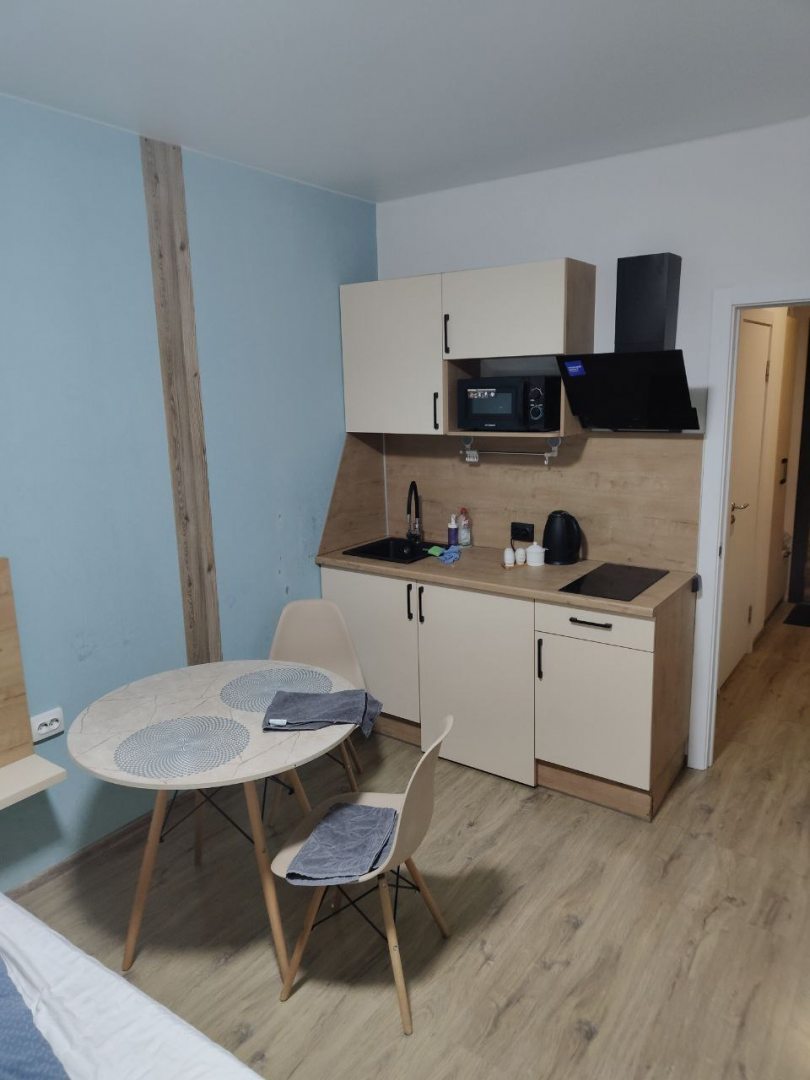 В Студио номере много чего привлекательного. Понравился прикольный дизайн часов. Отмечу и отличную звукоизоляцию, наличие вентилятора, скоростного интернета. На кухне есть электроплита, посуда, кастрюли для приготовления. Еще рядом расположен батутный парк, скалодром и бассейн. Мне понравилось, досуг организовали быстро.