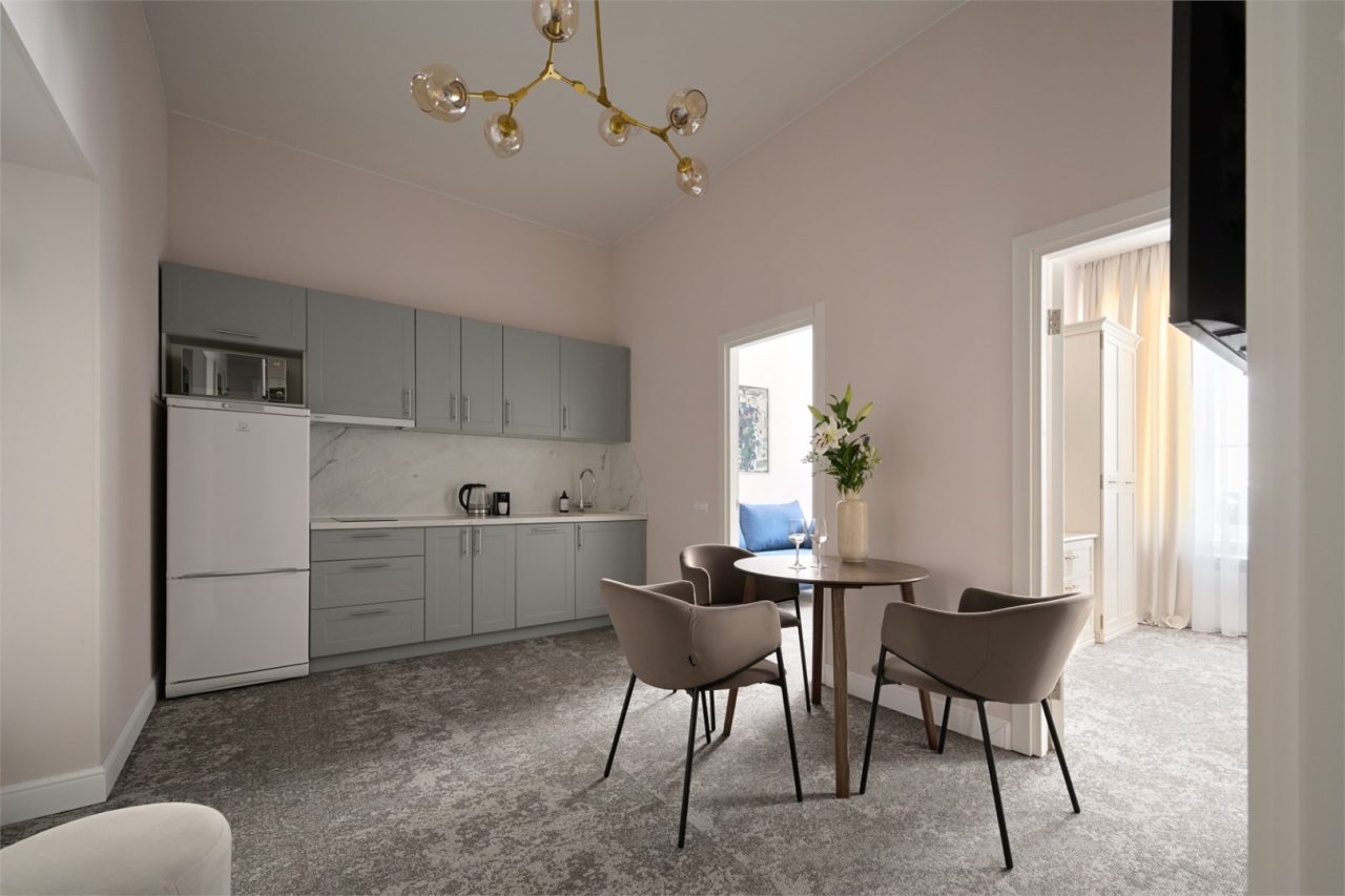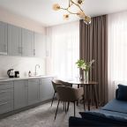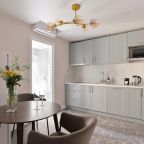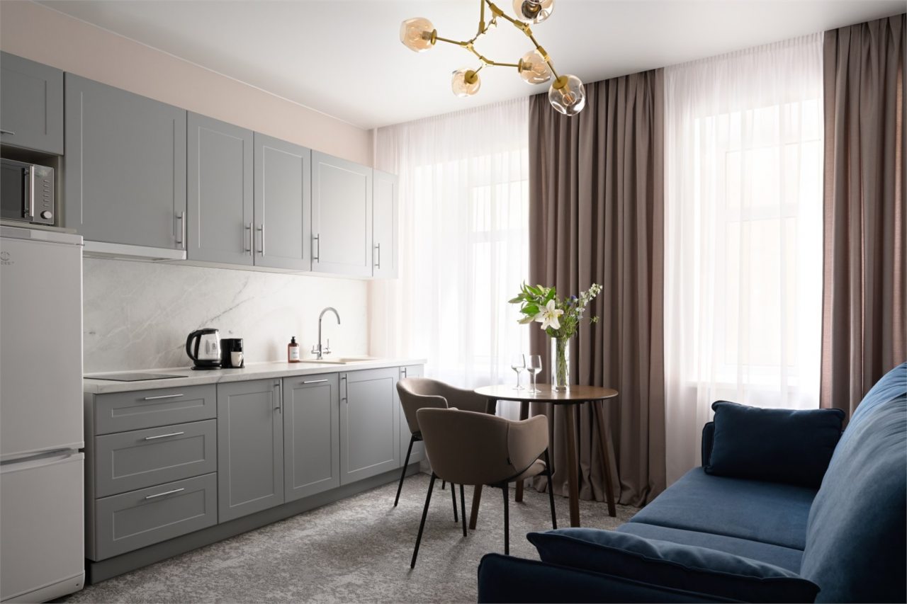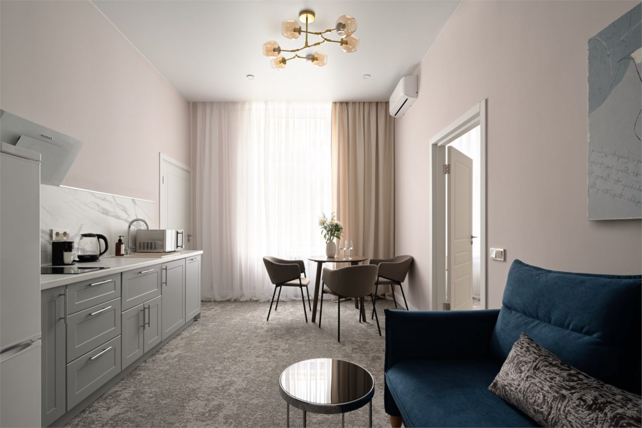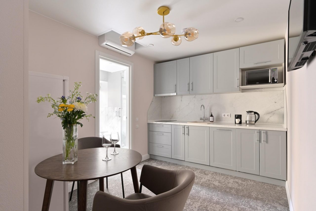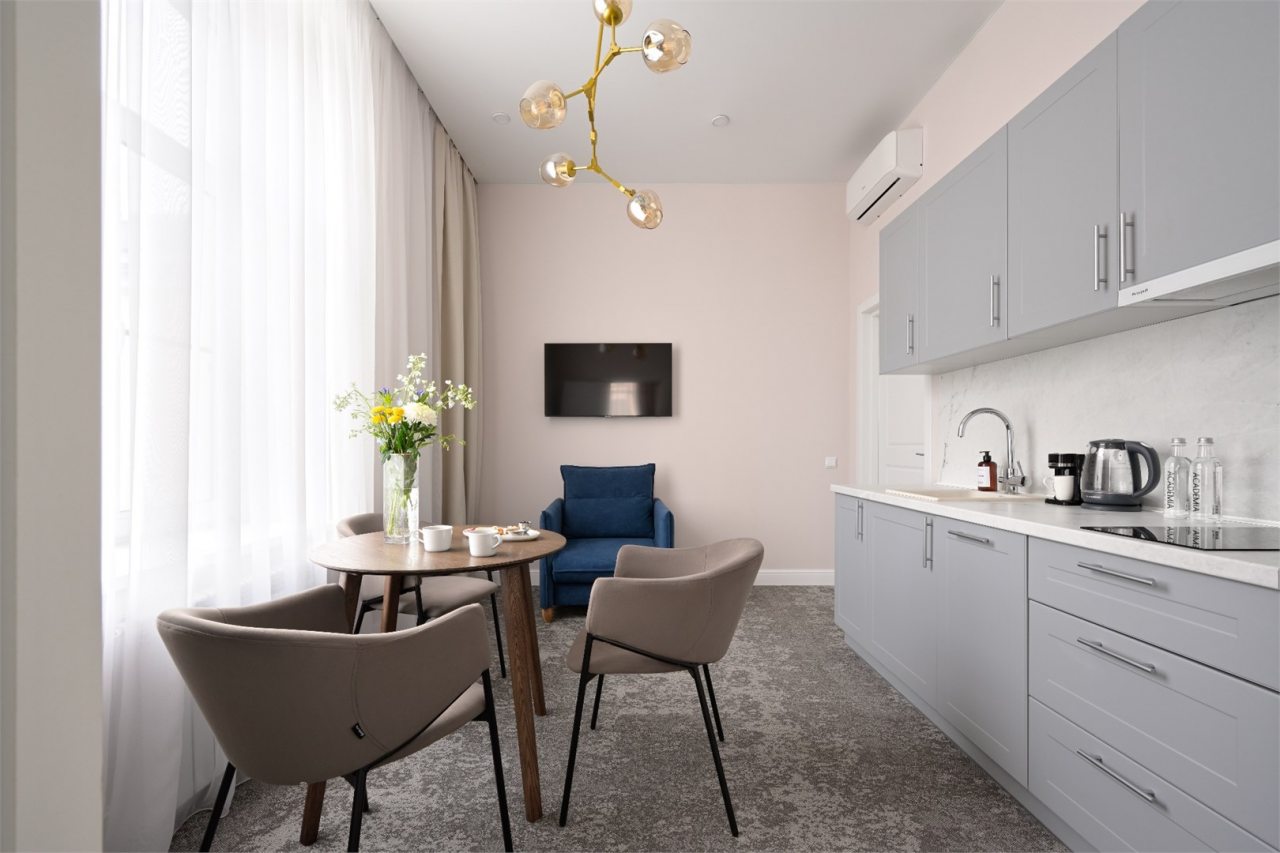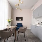 Номера просторные и светлые, в них царит уют и прекрасная тишина, которая позволяет хорошо выспаться и расслабиться. Особое удовольствие доставляет кухня с полным набором техники: посудомоечная машина, кофемашина и прочие мелочи, продуманные до мелочей. В ванной комнате — и ванна, и душевая кабина, а стиральная машина добавляет удобства особенно для длительного пребывания.