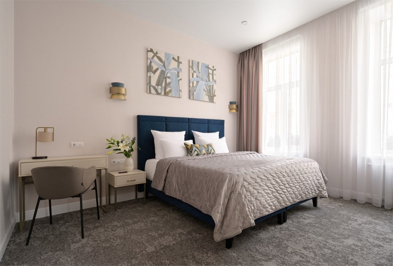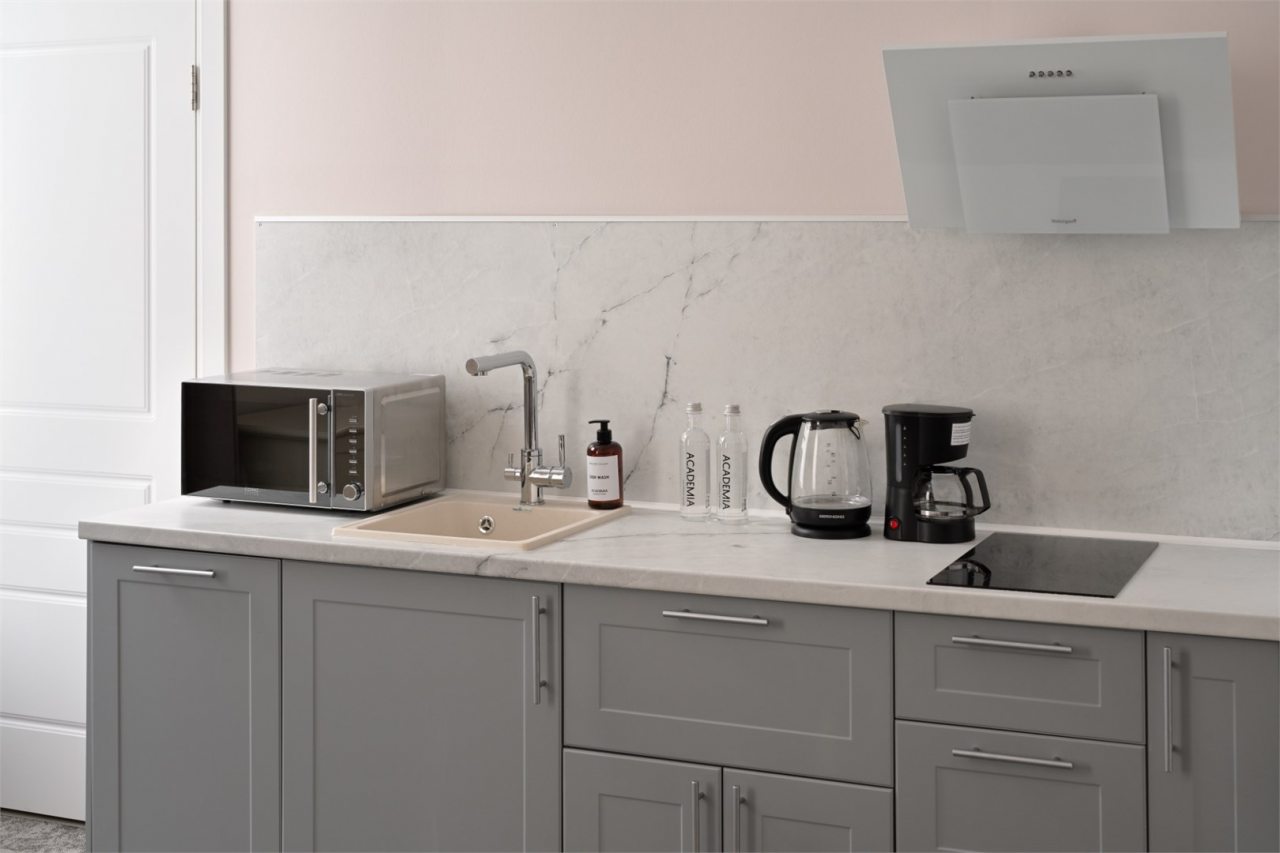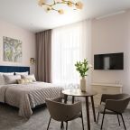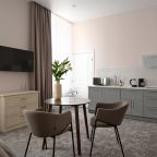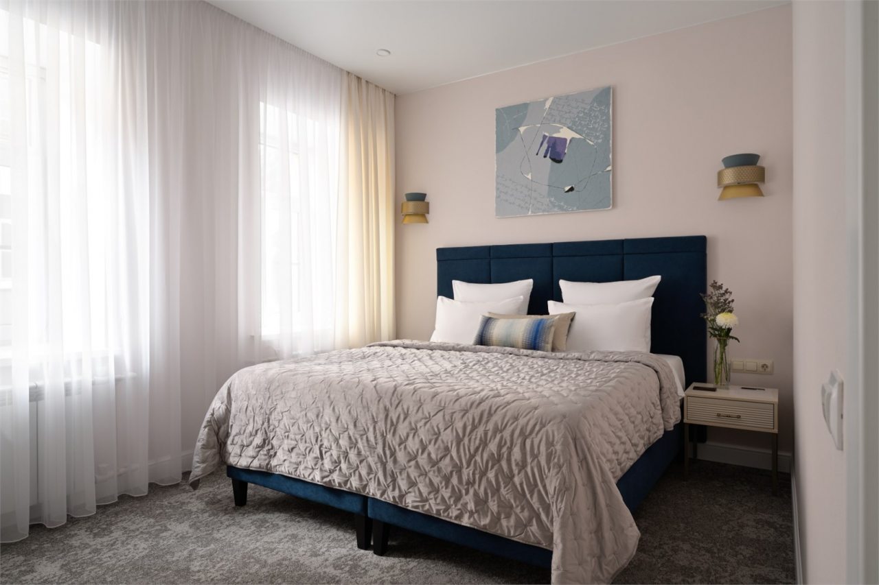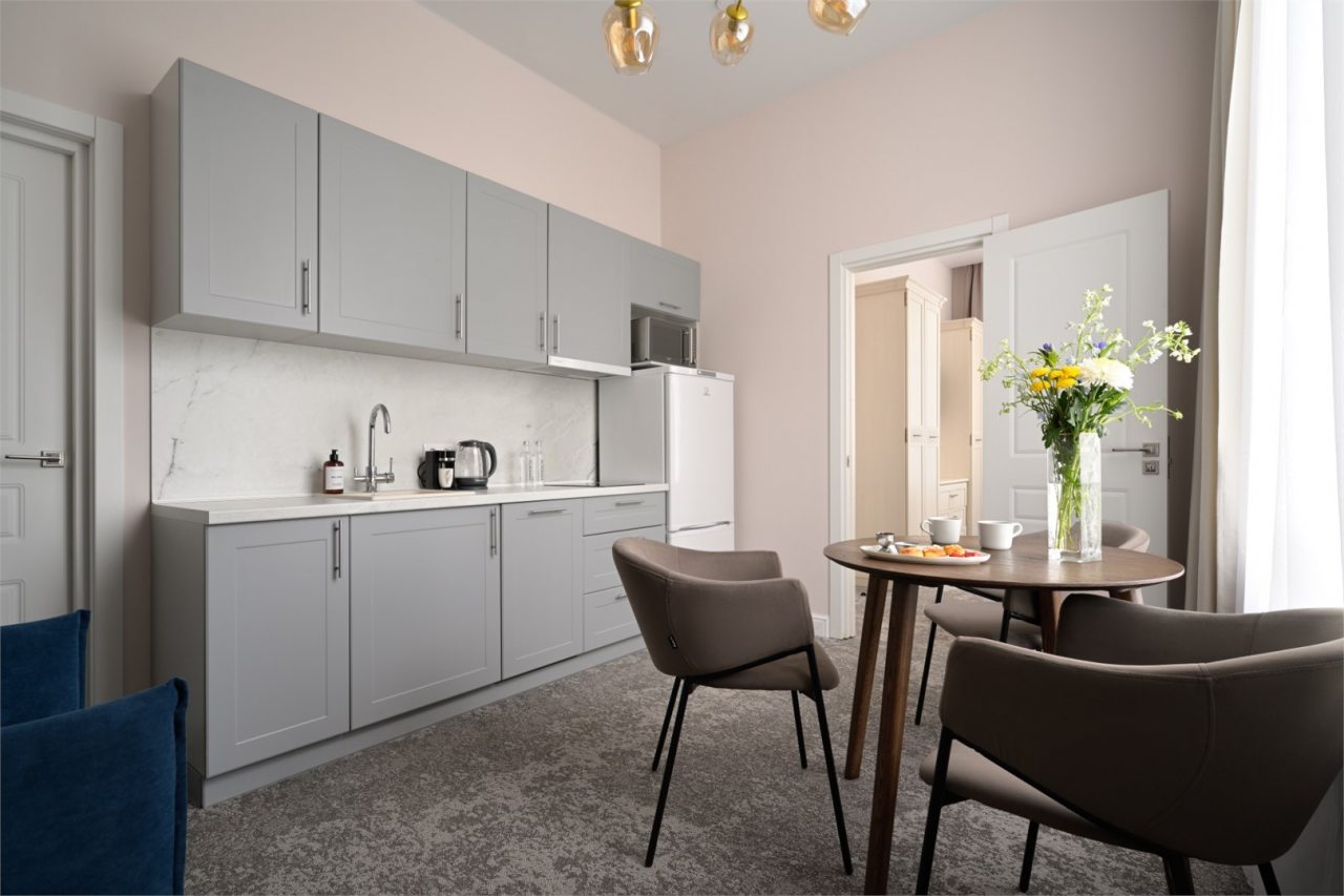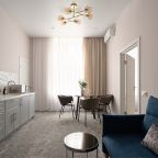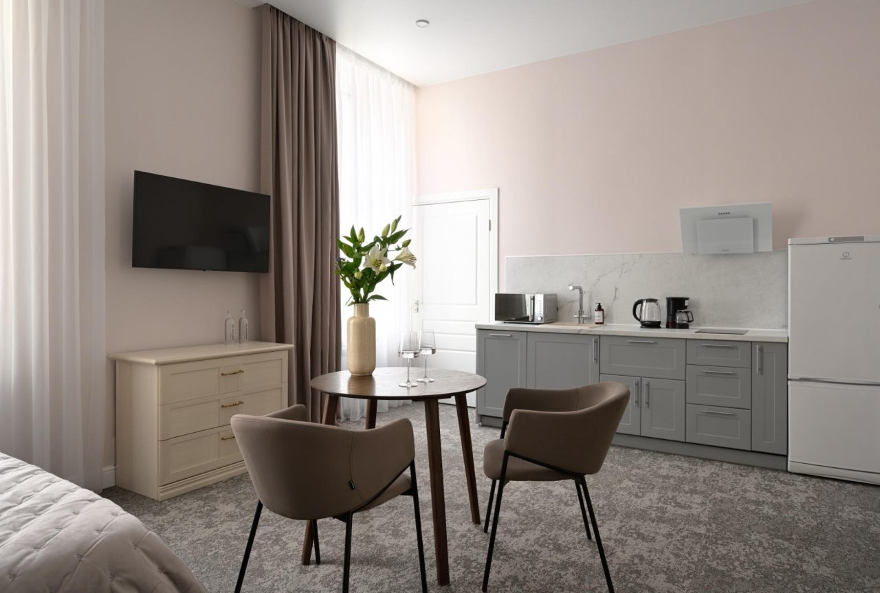 Номера просторные и светлые, в них царит уют и прекрасная тишина, которая позволяет хорошо выспаться и расслабиться. Особое удовольствие доставляет кухня с полным набором техники: посудомоечная машина, кофемашина и прочие мелочи, продуманные до мелочей. В ванной комнате — и ванна, и душевая кабина, а стиральная машина добавляет удобства особенно для длительного пребывания.