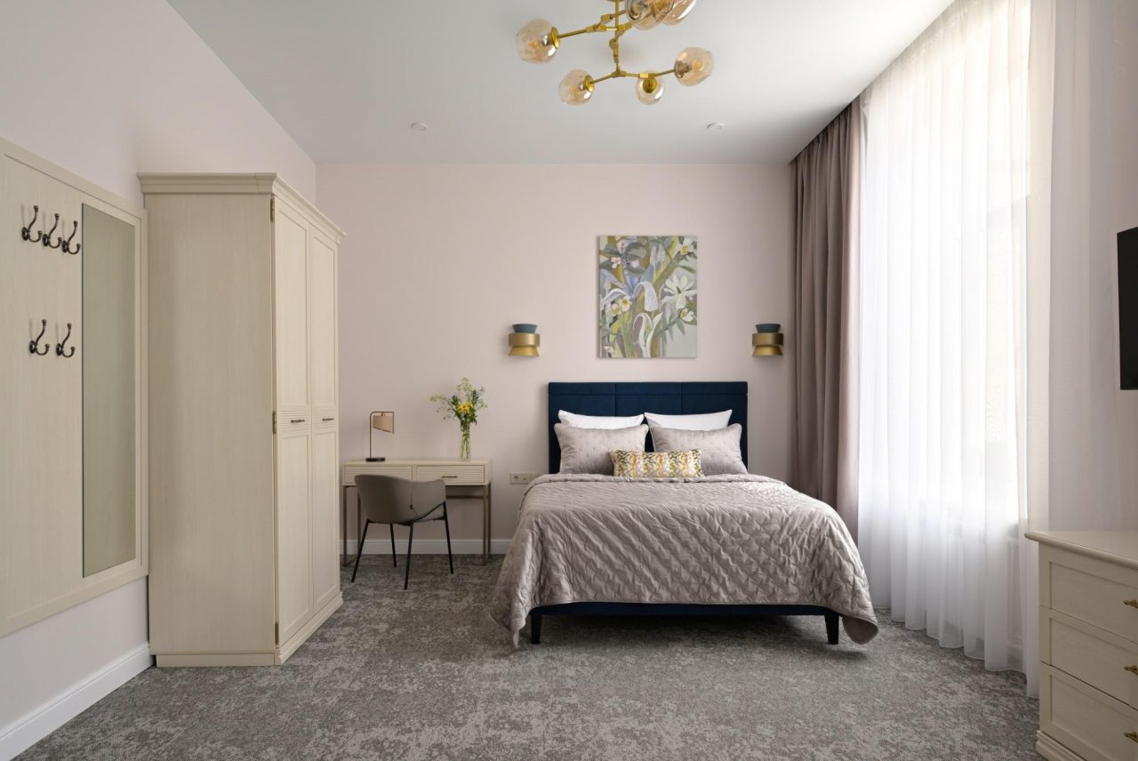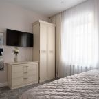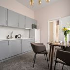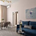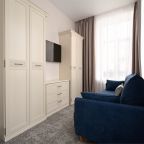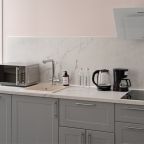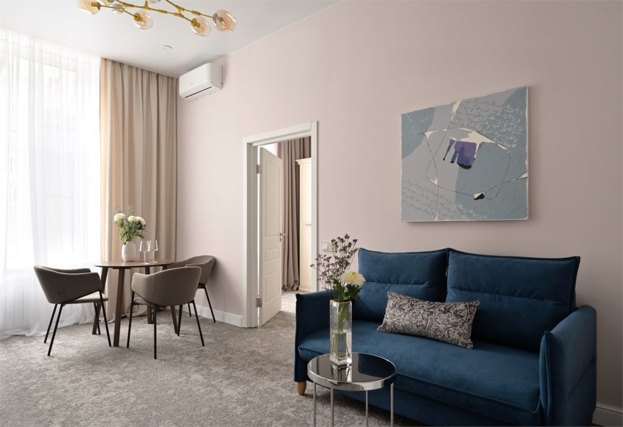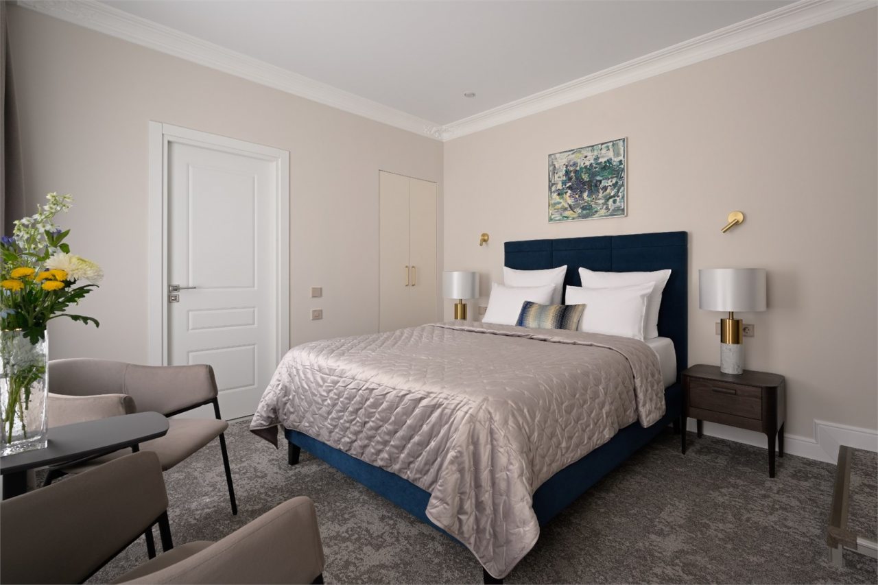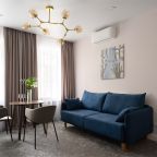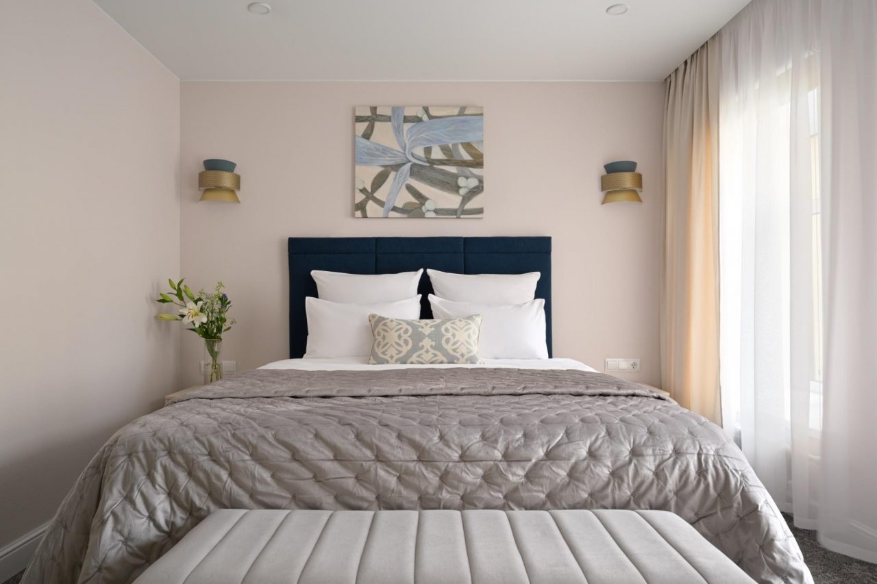 Номера просторные и светлые, в них царит уют и прекрасная тишина, которая позволяет хорошо выспаться и расслабиться. Особое удовольствие доставляет кухня с полным набором техники: посудомоечная машина, кофемашина и прочие мелочи, продуманные до мелочей. В ванной комнате — и ванна, и душевая кабина, а стиральная машина добавляет удобства особенно для длительного пребывания.
