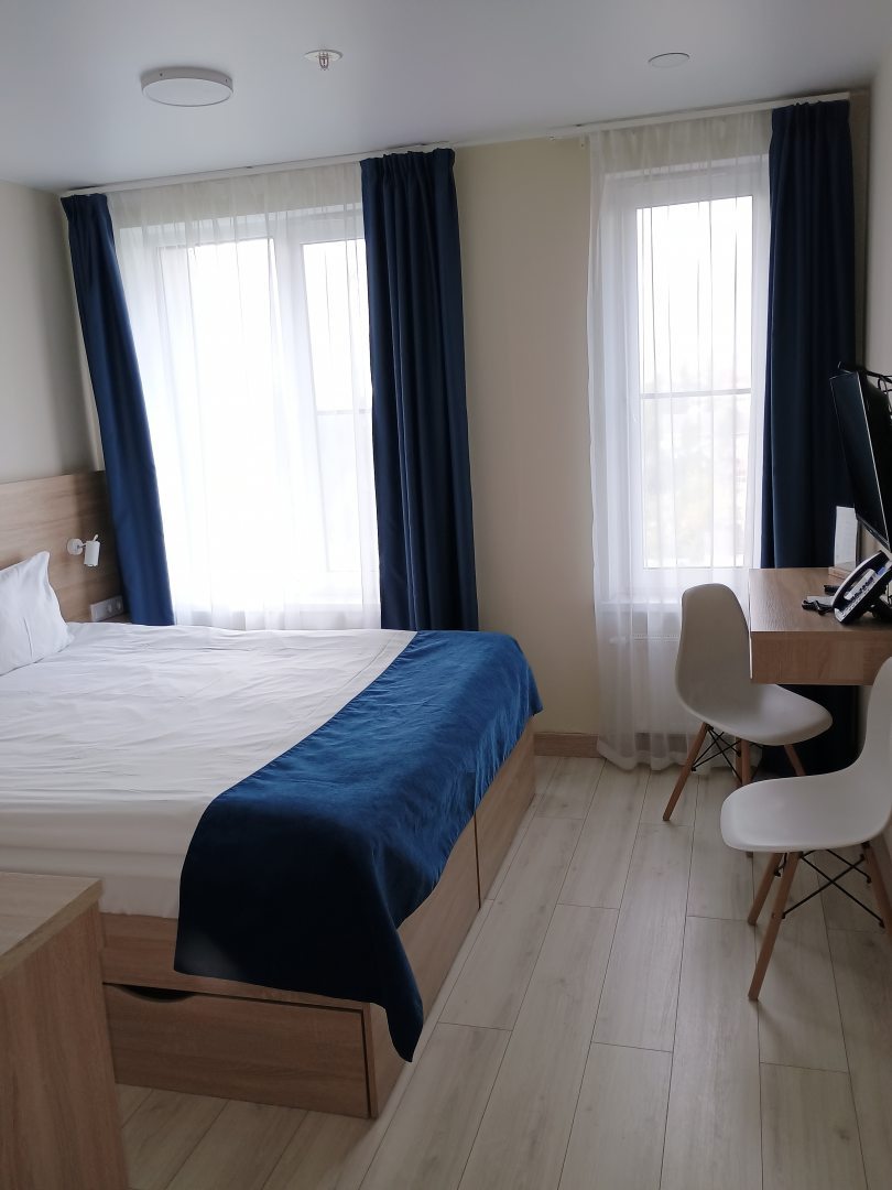 Отель расположен в десяти минутах ходьбы от станции метро "Чёрная речка", до Невского проспекта проехать всего два участка. Номер в гостинице просторный, светлый, с кухней, на которой есть всё для приготовления пищи: двухкомфорочная плита, микроволновка, чайник, холодильник, раковина для мытья посуды, посуда. На первом этаже находится ресторан. Достаточно вешалок для вещей. Уборка в номере ежедневная и качественная, за неделю дважды заменили постельное бельё. Полотенца меняли чаще. Персонал вежливый, доброжелательный. Спать было комфортно, не шумно. Вид из окна на Чёрную речку, вечером видна подсвечивающаяся телевизионная вышка. Замки дверей - электронные. В коридоре - кулер с питьевой водой. При выезде из отеля попросили персонал вызвать такси, что и было сделано. Мы очень довольны!