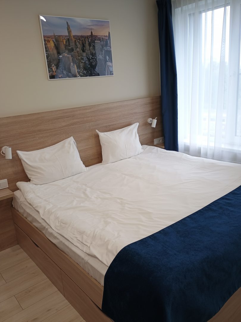 Отель расположен в тихом спальном районе,вдали от городской суеты,недалеко от метро.Здание новое,с неплохим ремонтом,чистые номера со всем необходимым для спокойного отдыха,благоустроенная территория,прачечная,кафе на 1 этаже,очень доброжелательные девушки всегда помогут с размещением,а также по любым другим вопросам.Удобно,что в номере есть плита для приготовления пищи,холодильник,микроволновка,посуда.Отличная кровать,сон просто замечательный,если окна выходят на речушку.Номера относительно недорогие,ежедневная уборка,регулярная смена белья.Удобный санузел.В номере небольшой сейф.