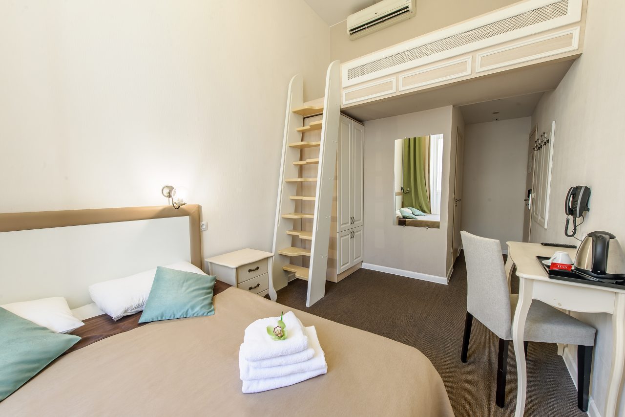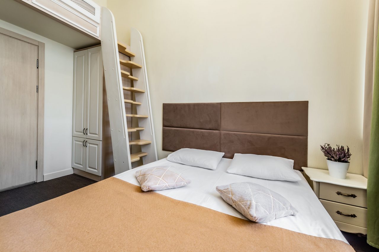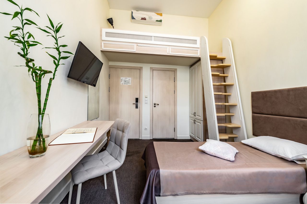 Из недостатков: вход в номер располагается в зоне кухни на 2м этаже - спать не дали утром совсем - с 8утра в выходной по сути день за дверью разговоры в полный голос, гряканье посуды. Если хотите выспаться - лучше этот номер не брать.