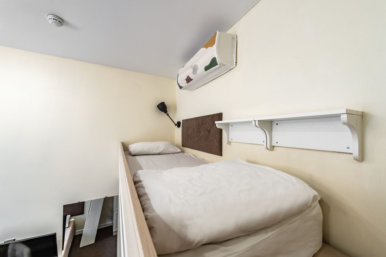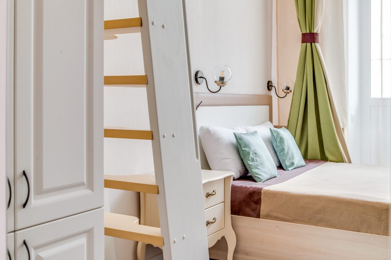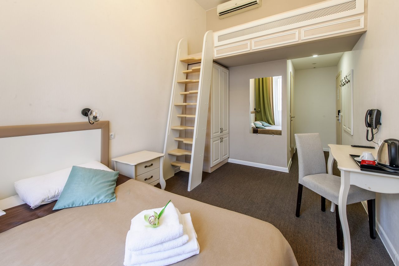 Из недостатков: вход в номер располагается в зоне кухни на 2м этаже - спать не дали утром совсем - с 8утра в выходной по сути день за дверью разговоры в полный голос, гряканье посуды. Если хотите выспаться - лучше этот номер не брать.