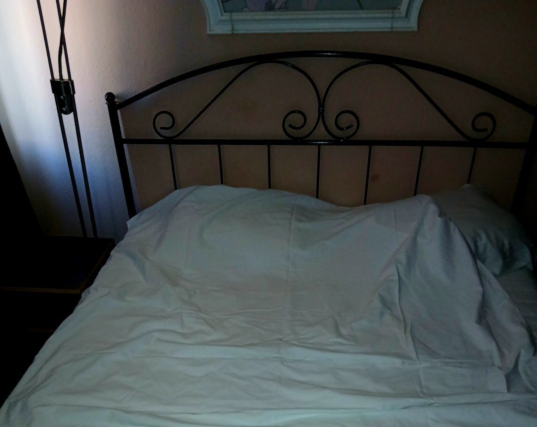 Сам номер небольшой, но есть все для удобства проживания: удобная двухспальная кровать застелена чистым сатиновым бельем.