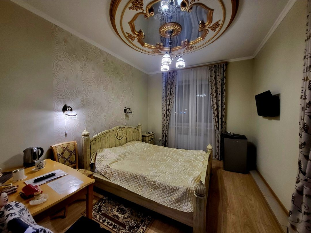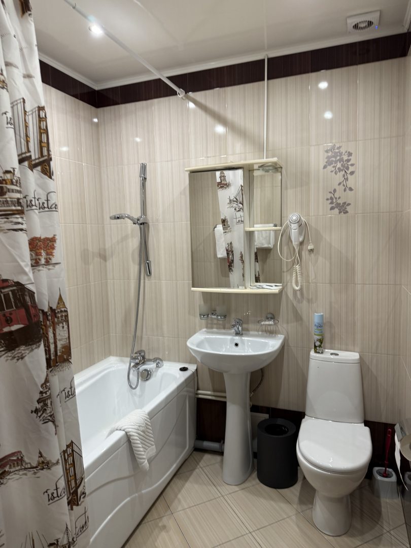 Здравствуйте!Удобное расположение,всё рядом,множество кафешек,магазинов,автобусные остановки и достопримечательности. Везде чистенько,большая комната,тихо. Есть холодильник,чайник,тапочки,большая удобная кровать,светильники над кроватью,стол.