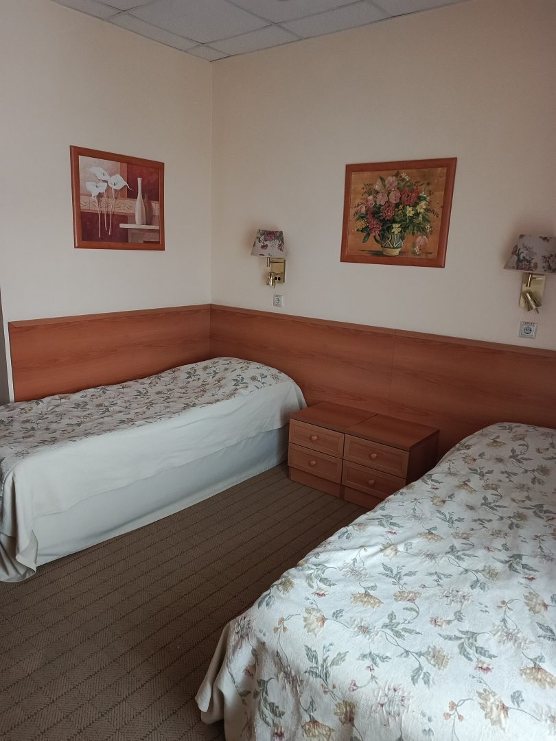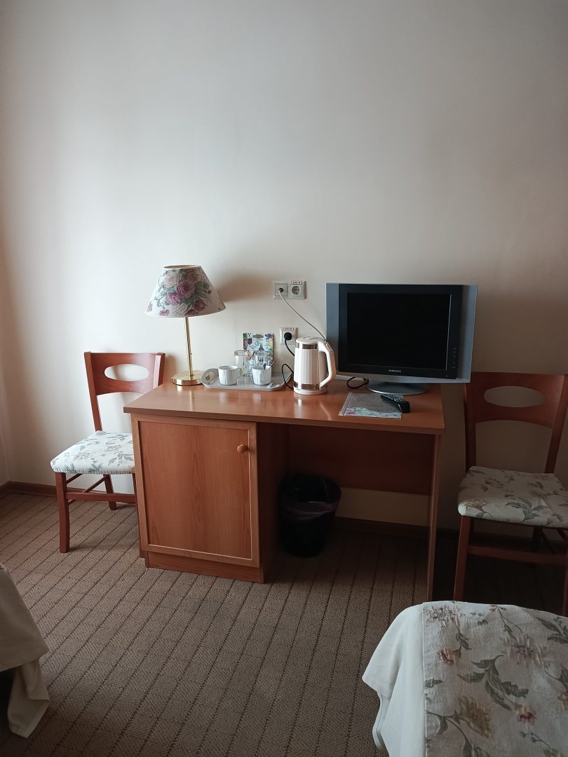 Отель расположен в 5 минутах от Лавры, номера чистые, все необходимое в номерах есть, кроме фена. Холодильник, кулер на этаже. Персонал вежливый и внимательный. Питание в трех вариантах под заказ. В номерах есть чайник, телевизор, вода, чай и сахар. В ванной комнате походный набор для каждого человека. Отель понравился. Рекомендую.