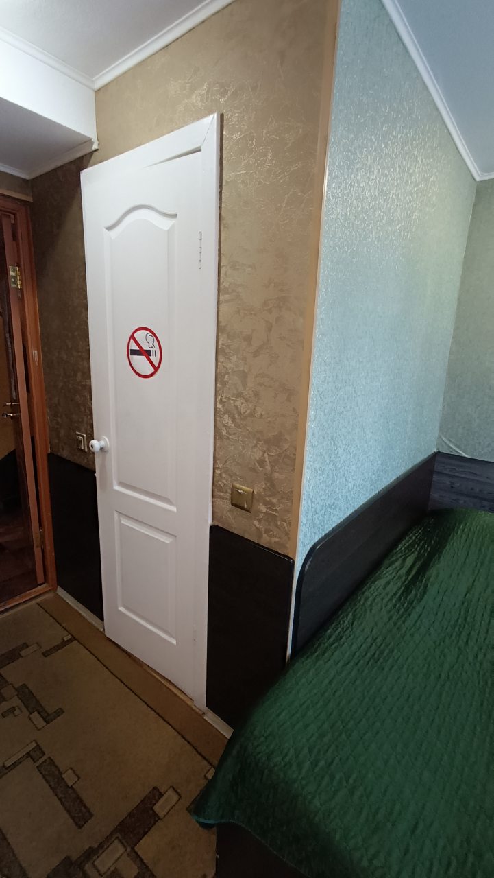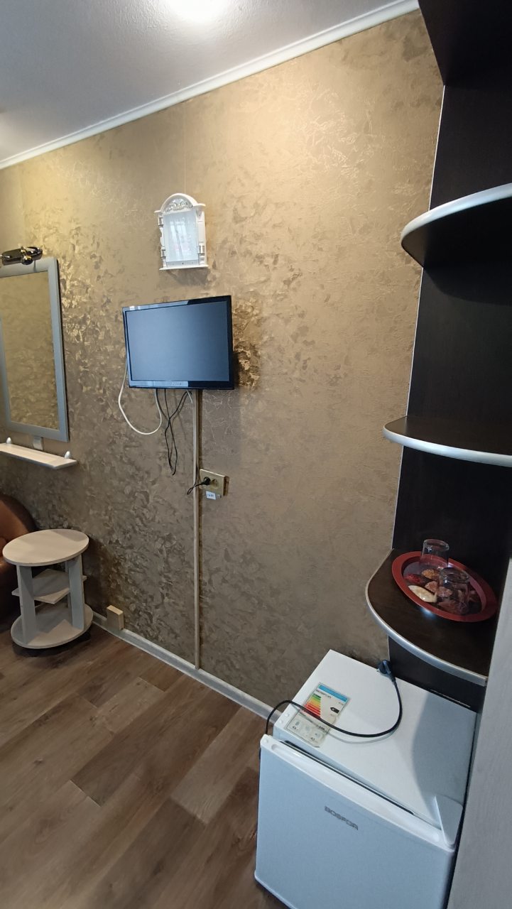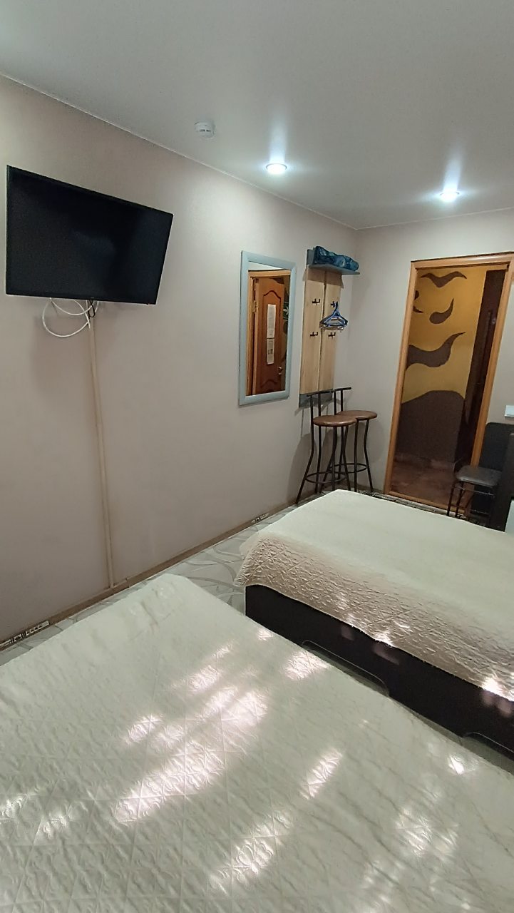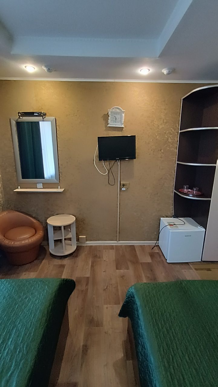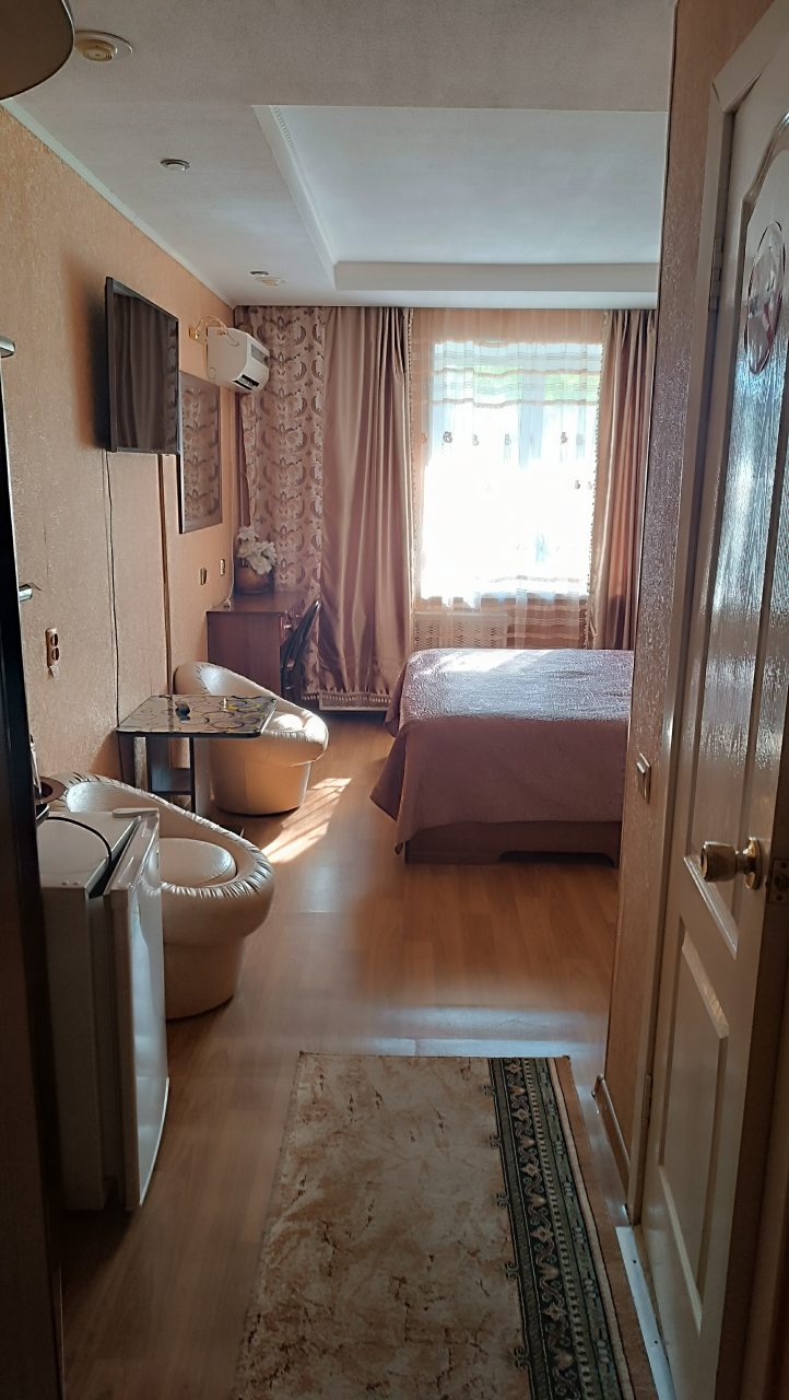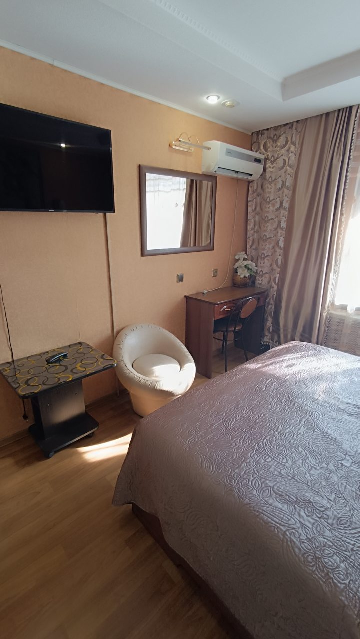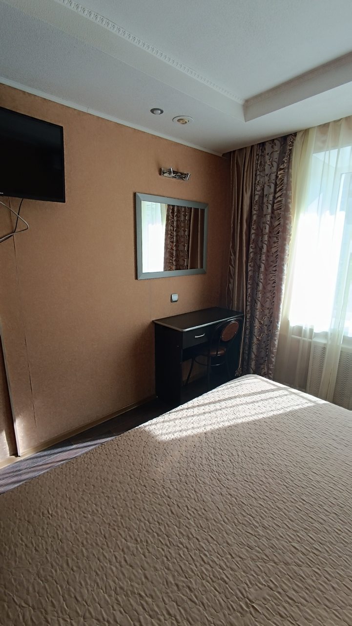 В номере уютно и чисто, все постельное белье чистое. Посторонних запахов в номере нет. Еда в баре вкусная. Администратор вежливый. Рядом парковка. Так же в номере есть телевизор и холодильник, небольшой санузел.