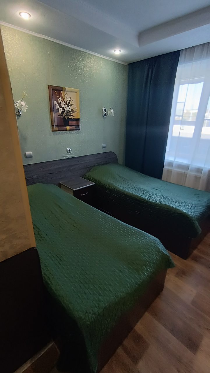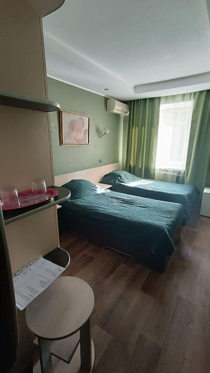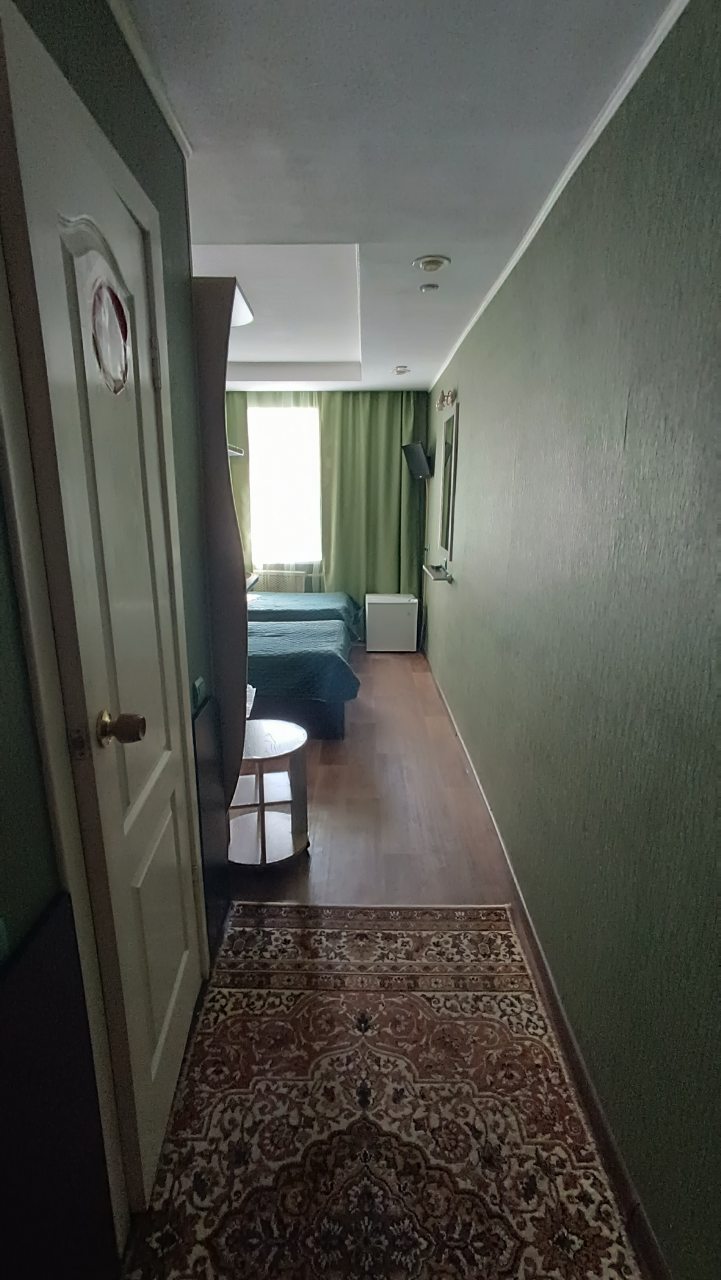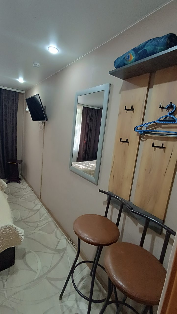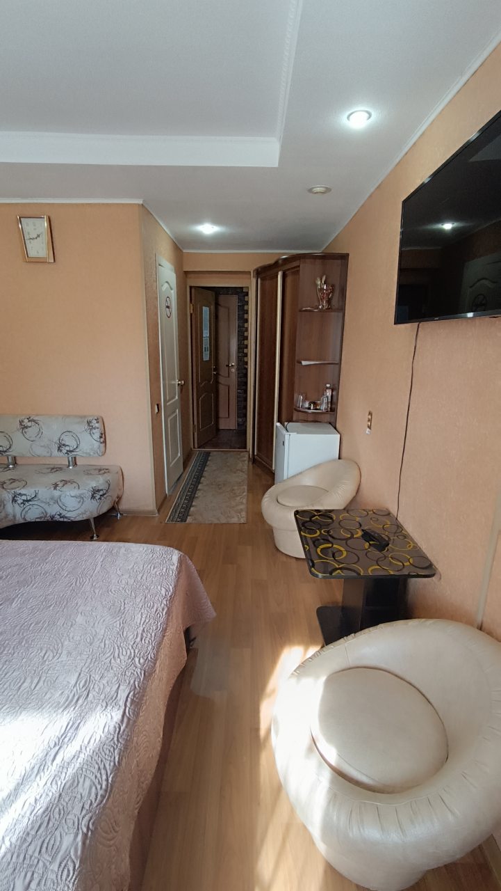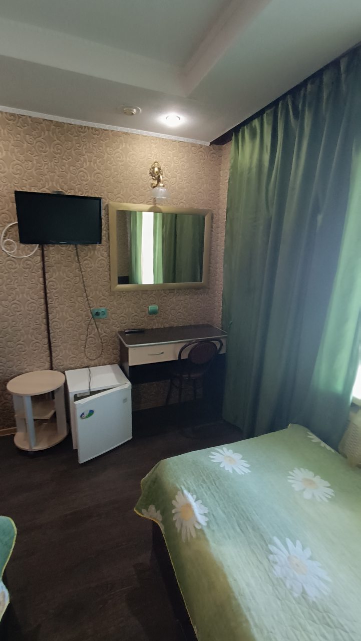 В номере уютно и чисто, все постельное белье чистое. Посторонних запахов в номере нет. Еда в баре вкусная. Администратор вежливый. Рядом парковка. Так же в номере есть телевизор и холодильник, небольшой санузел.