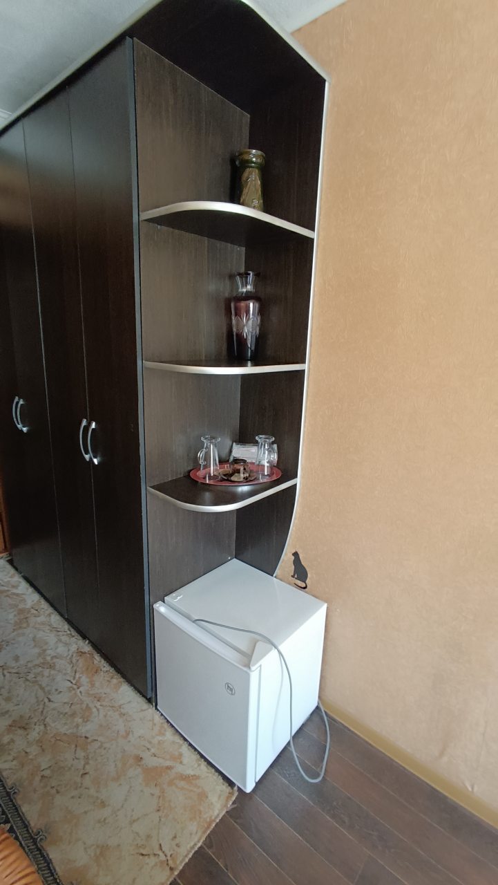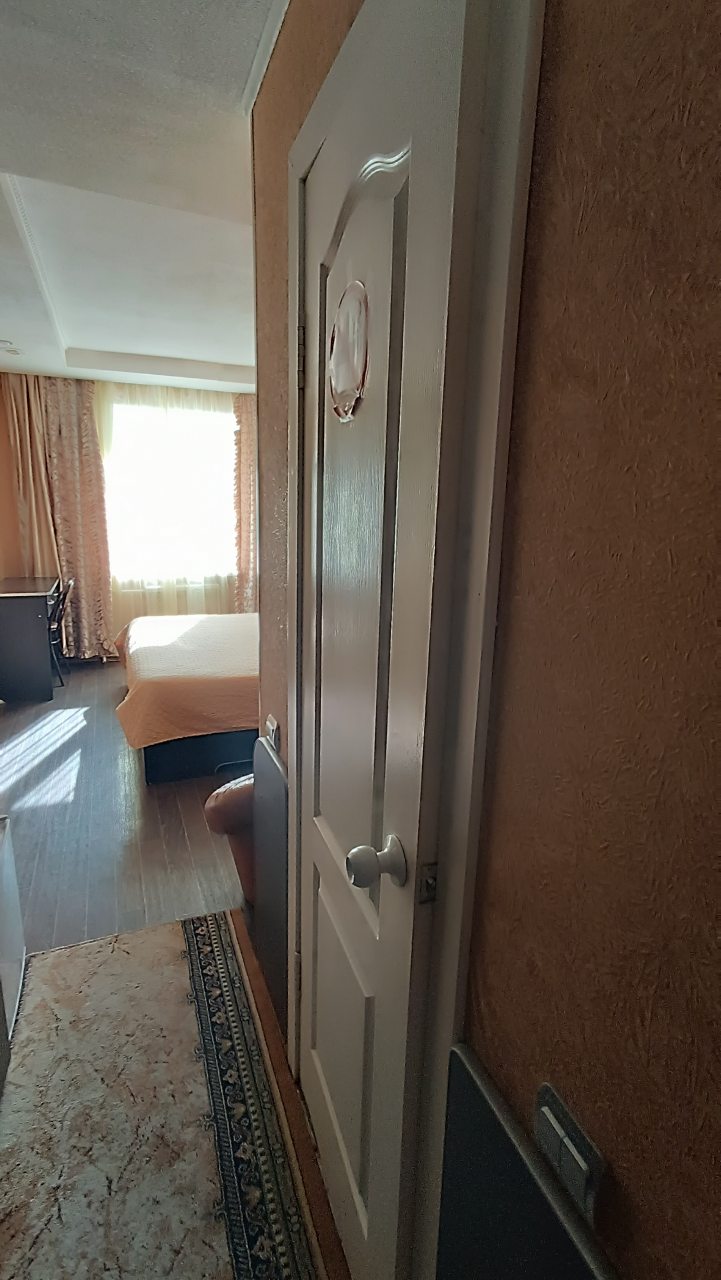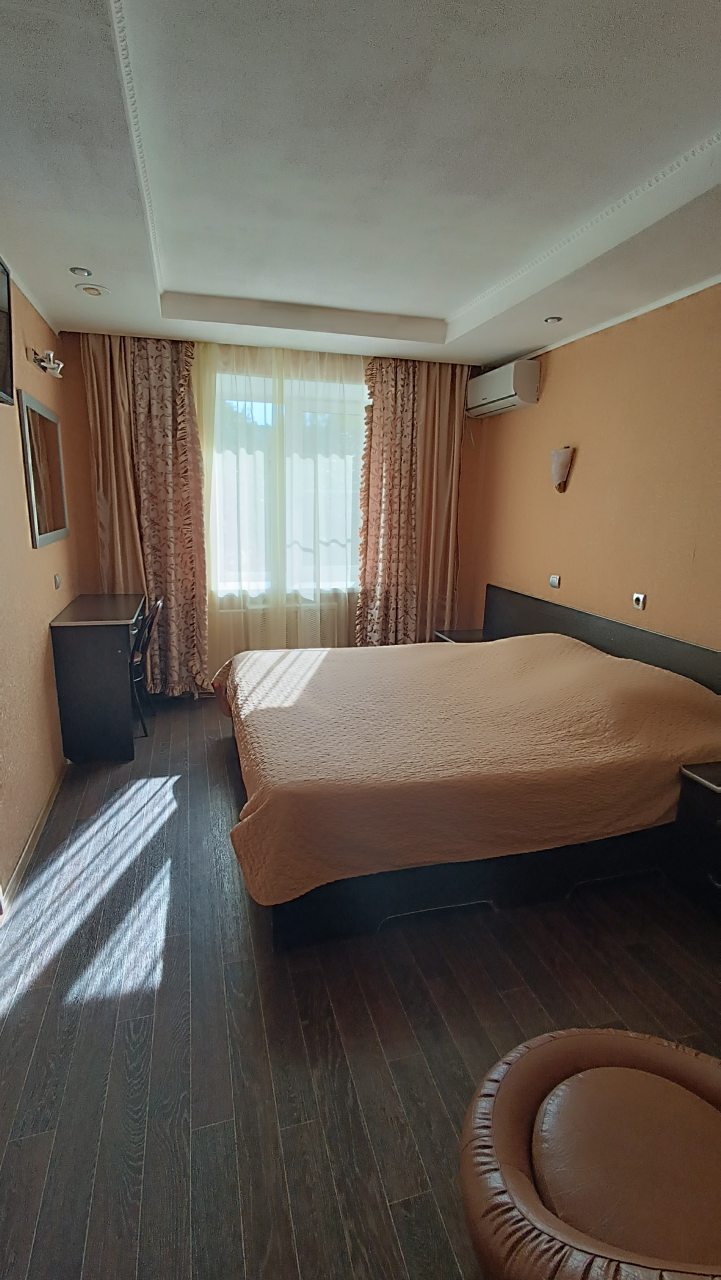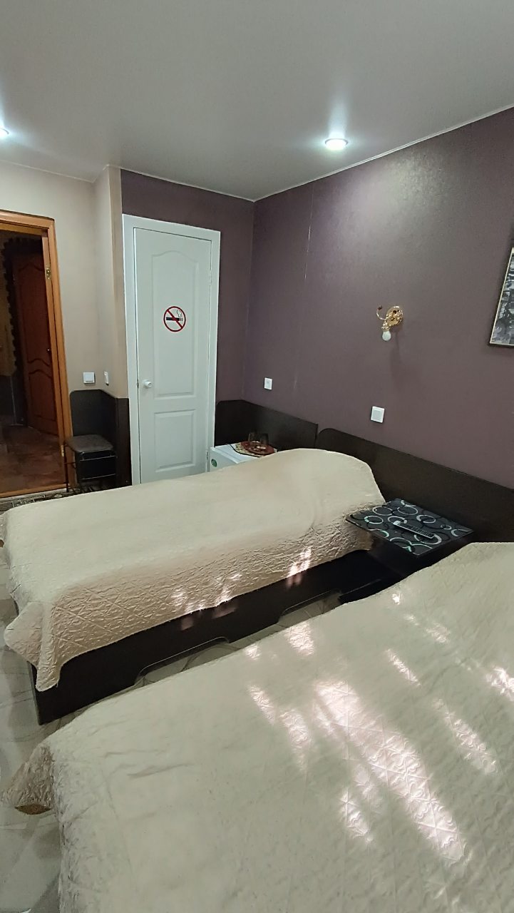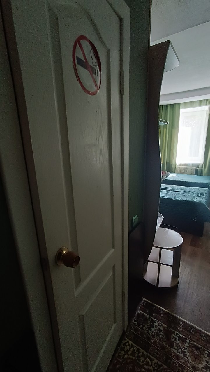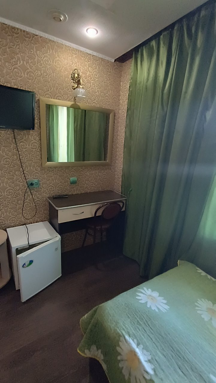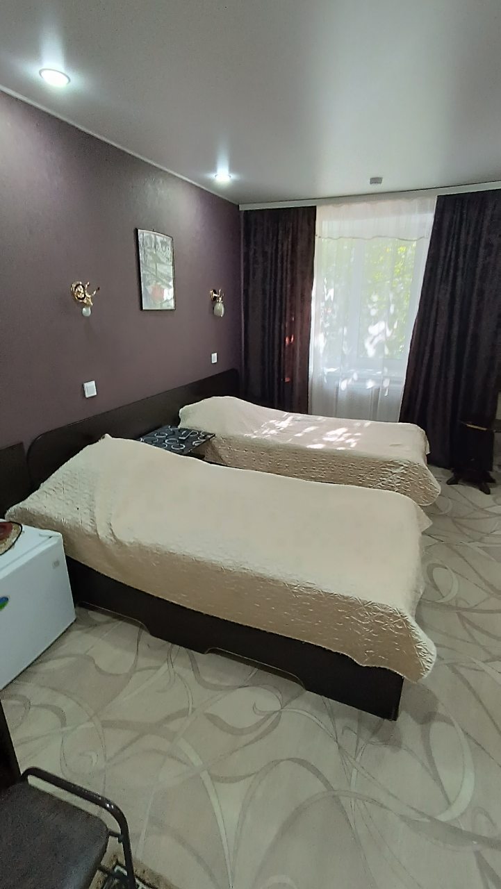 В номере уютно и чисто, все постельное белье чистое. Посторонних запахов в номере нет. Еда в баре вкусная. Администратор вежливый. Рядом парковка. Так же в номере есть телевизор и холодильник, небольшой санузел.