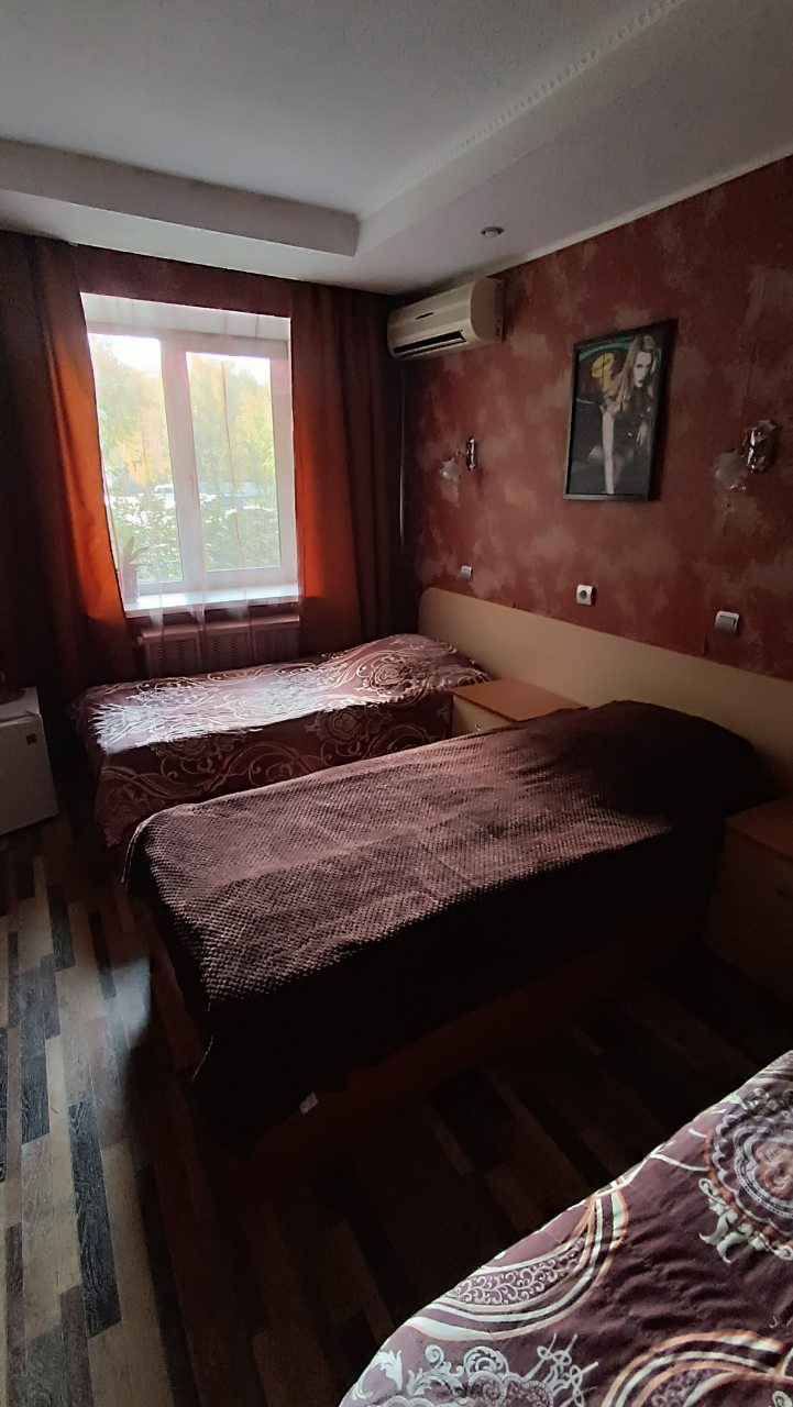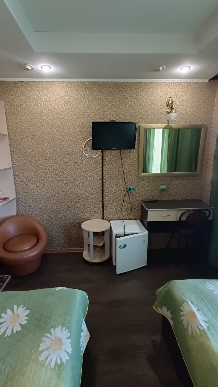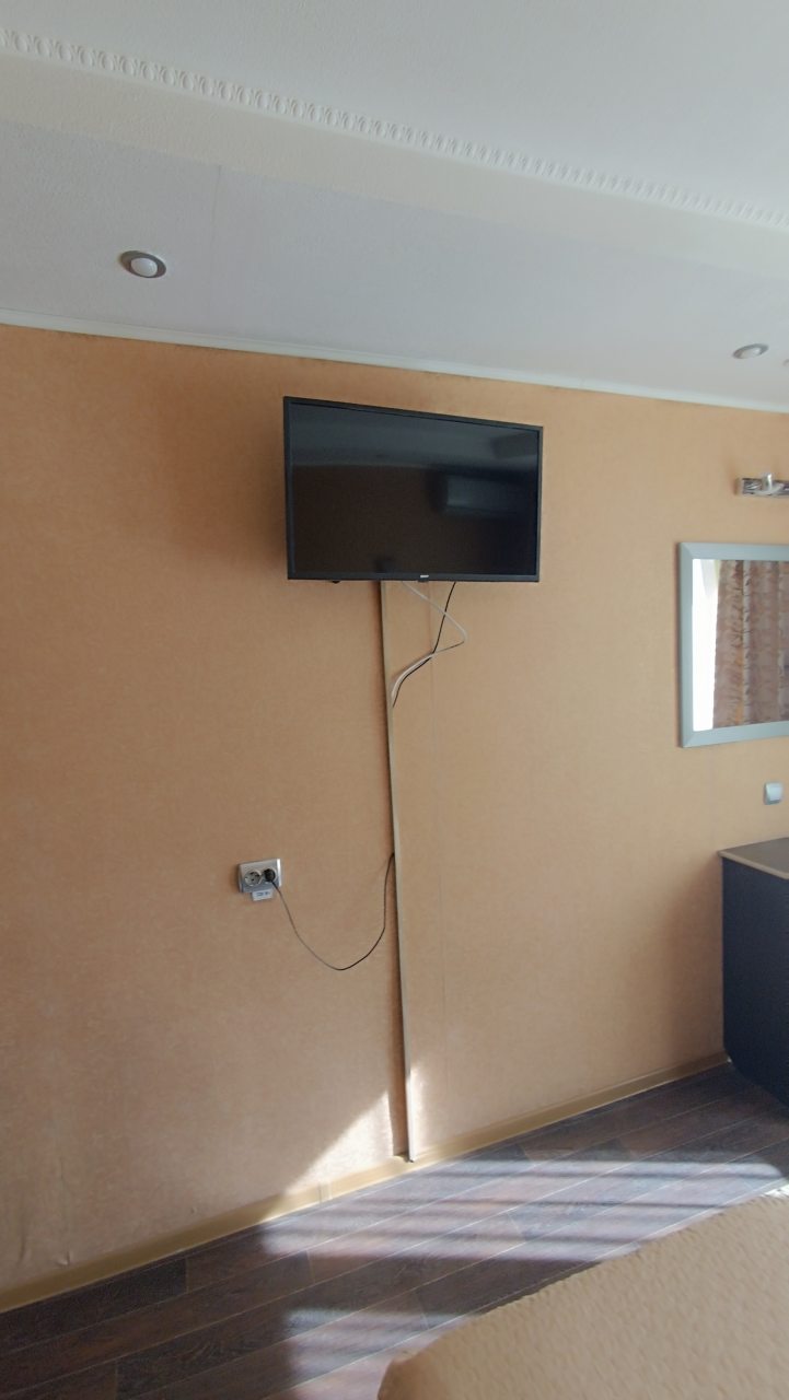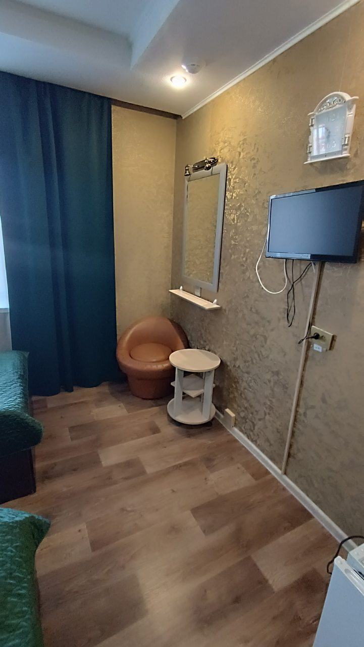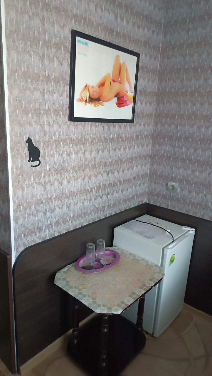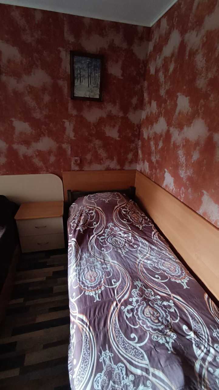 В номере уютно и чисто, все постельное белье чистое. Посторонних запахов в номере нет. Еда в баре вкусная. Администратор вежливый. Рядом парковка. Так же в номере есть телевизор и холодильник, небольшой санузел.