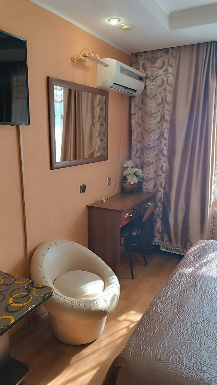 Очень удобная кровать с приятным постельным бельём, спать на ней – одно удовольствие. Есть удобный шкаф для одежды, что тоже создаёт комфорт при длительном проживании. Телевизор и интернет работают без перебоев, что добавляет удобства. Для желающих перекусить доступен ресторан с разнообразным меню. Радует также наличие кондиционера.