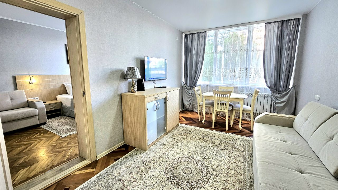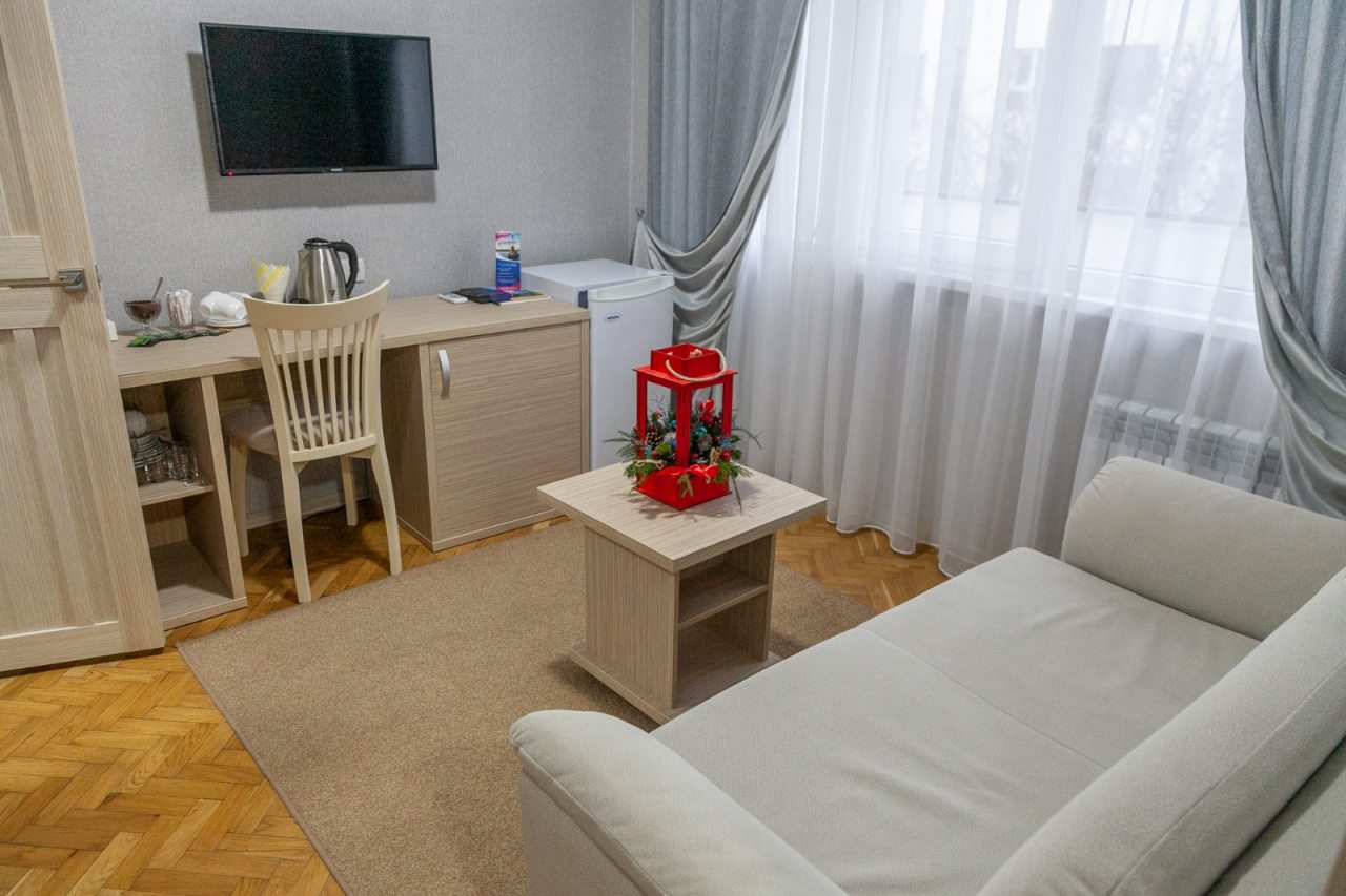 Из недостатков: в номере прокурено. Пол грязноват. Мебель разная, старая, но кровати удобные. Постель хорошая. Я жила в эконом. Посуды нет никакой, но есть холодильник. Вода для чая в куллере на этаже.