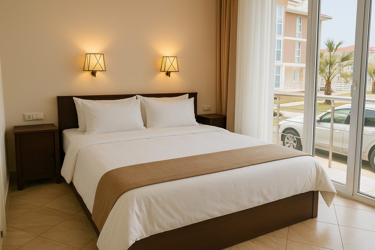 Расположение чудесное, так как транспорт недалеко, а моря вообще практически под боком. Комнаты светлые, уравновешенные. Мебель стильная, мягонькая. А все полотенца пахли свежестью. Порядок царил во всем.