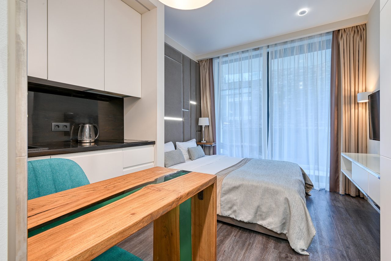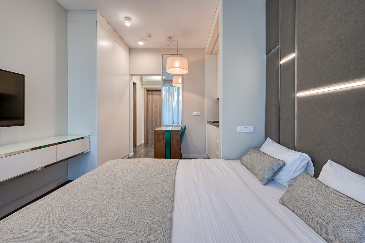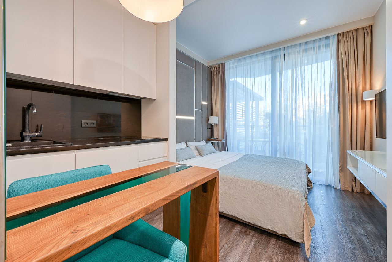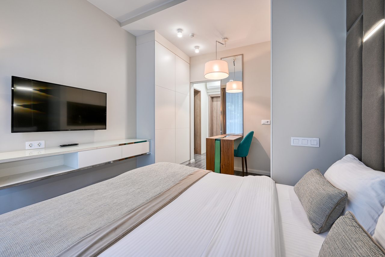 Красивый отель, расположенный на побережье Черного моря. В Сочи мы бываем часто, но в этом апарт-отеле остановились впервые. Выбрали размещение на двоих - двухместный стандарт. Пространство у нас было оформлено в приятных светлых тонах. Шкафов много, они все встроены в ниши, их практически незаметно. Но зато они очень вместительные. По стоимости вышло выгодно, для первой линии вообще шикарно.