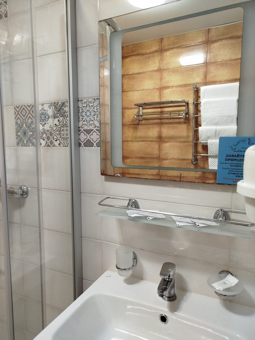 Симпатичный и уютный отель с прекрасным месторасположением, чистый с удобной кроватью. Очень порадовали наличие в номере микроволновки, холодильника, шкафчика с необходимой посудой, эл.чайника, раковиной в комнате, двухярусной тележки на колёсиках. Приятные девушки администраторы. Номер с видом на реку. Пиццерия с уличным кафе у отеля, рядом другие кафе и магазины, жд вокзал в 10 минутах ходьбы и ТЦ Моремолл и ТЦ Александрия близко. Отдыхала с комфортом и радостью в замечательном отеле Чайковский!