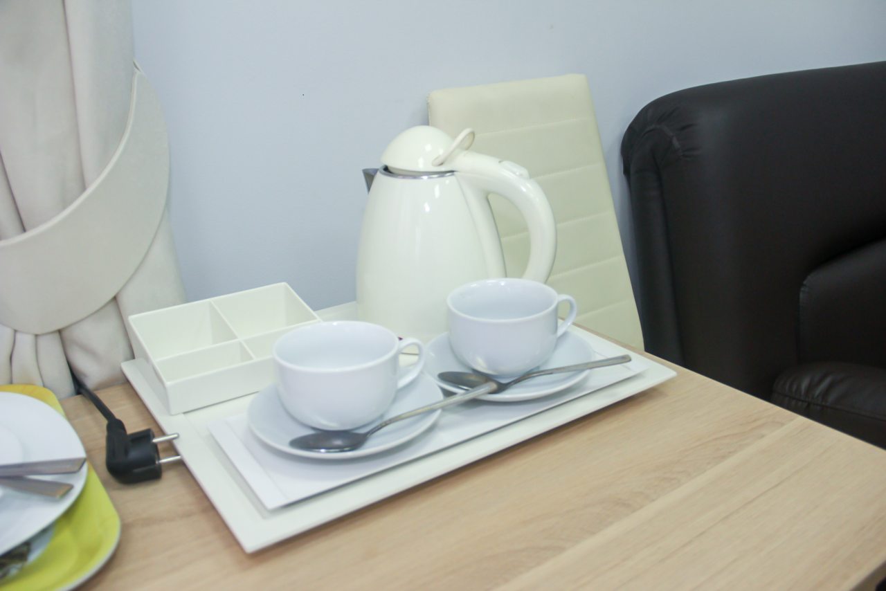 Чайник, кружки, стаканы, блюдца, тарелки, ложки, вилки, разделочная доска. Всё чистое.