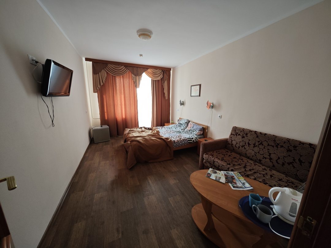 Хорошее расположение, балконы и площадь номера. Чайник, холодильник и нормально работающий тв в номере, набор необходимой посуды, микроволновка на этаже- все это очень хорошо и удобно
