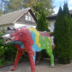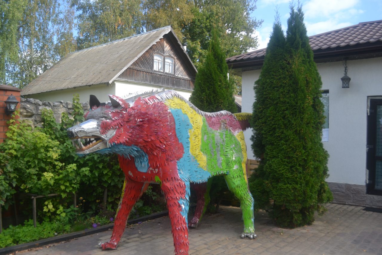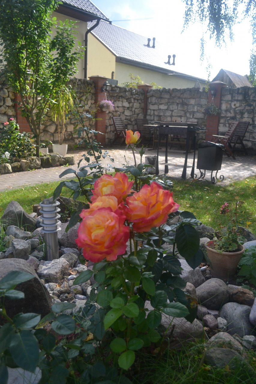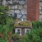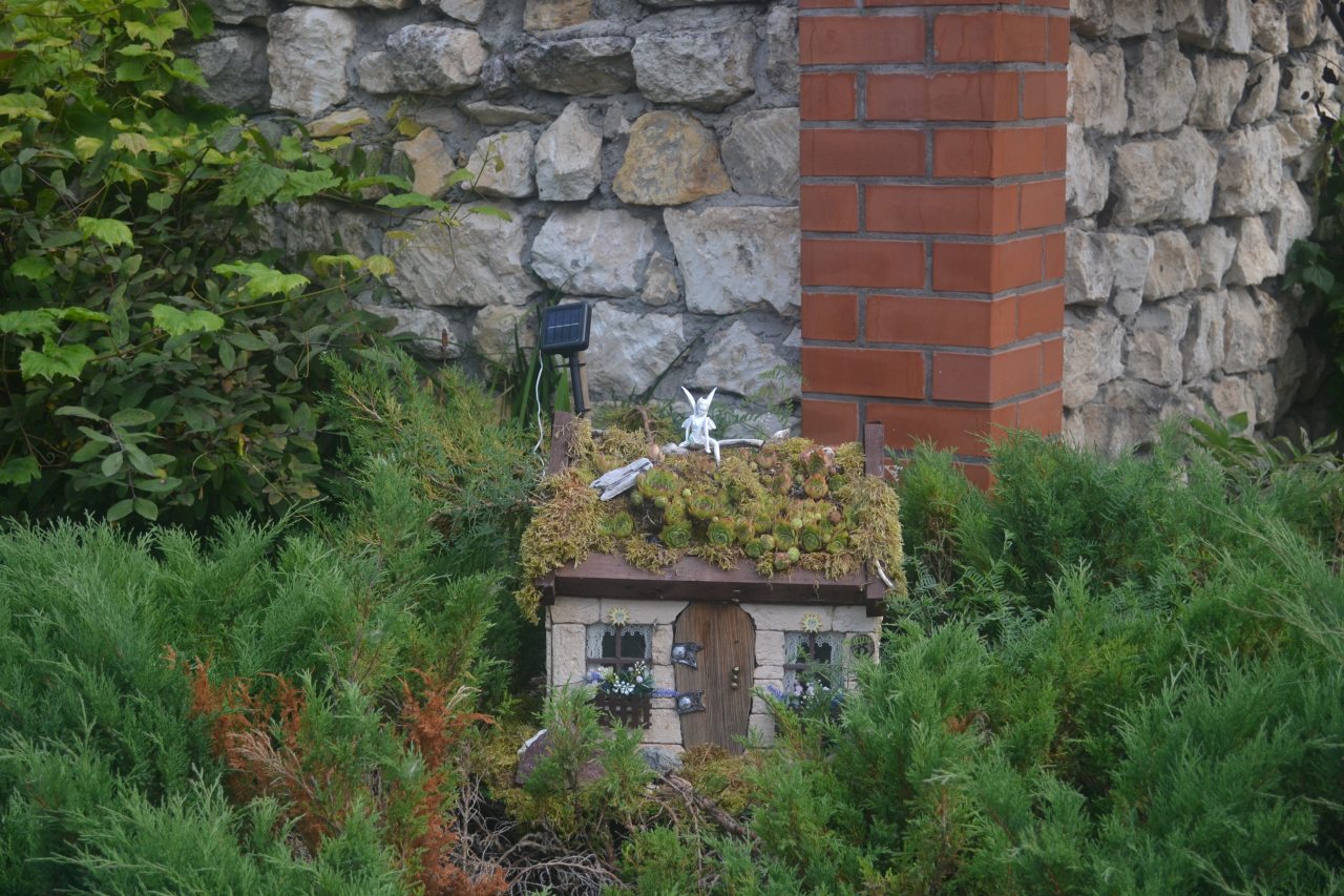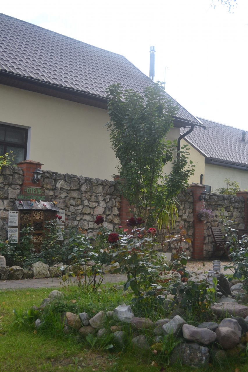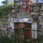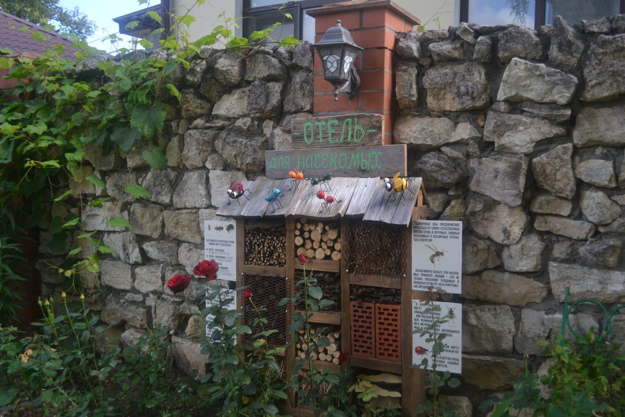 Дворовая территория с несколькими зданиями по-домашнему ухожена, обнесена общим забором, оформлена камнями. Зелень, цветы, мангальная зона, имеется даже отель для насекомых. Давно хотим сделать на даче такой отельчик, но видели его только на картинках, а теперь осмотрели его вживую.