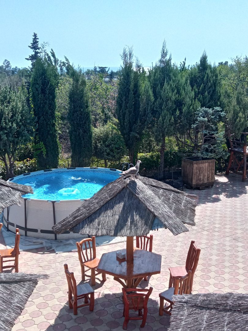 На территории - деревянные столы с навесами, бассейн небольшой детский, мангал, стоянка авто. Живет собачка очень милая и несколько котов.
