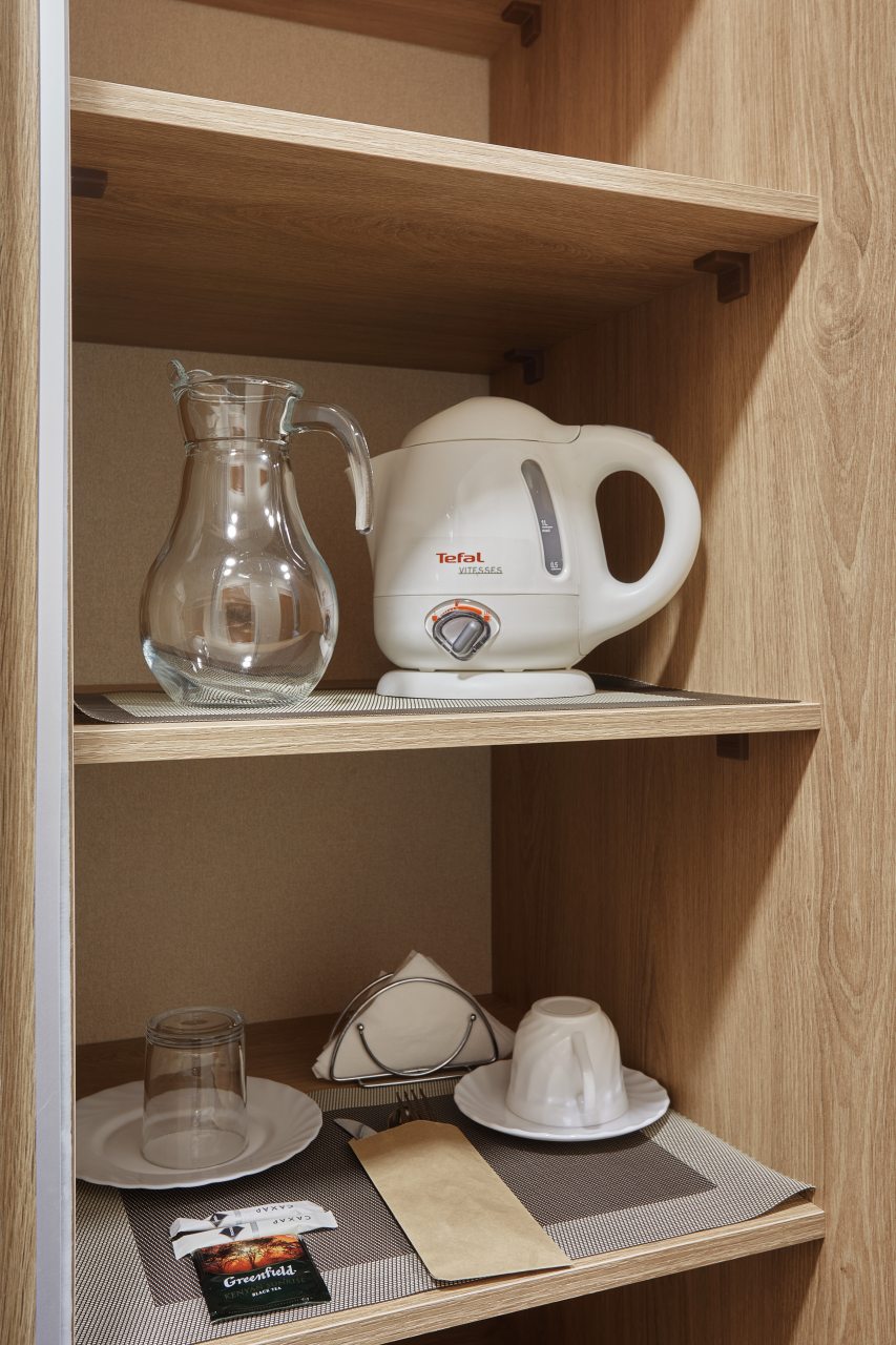 В номере есть чайникчайный набор, посуда