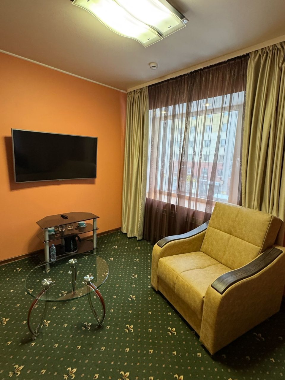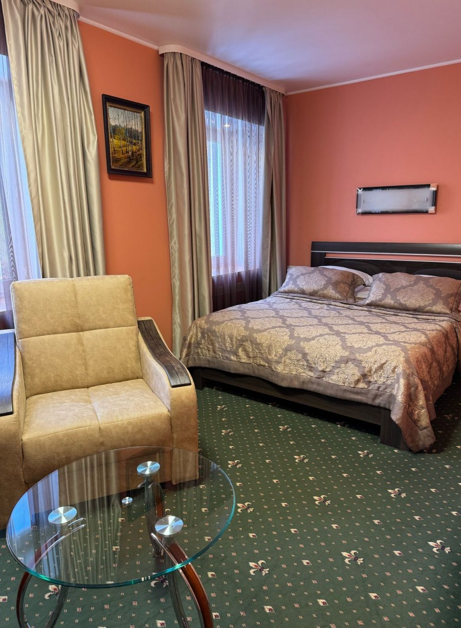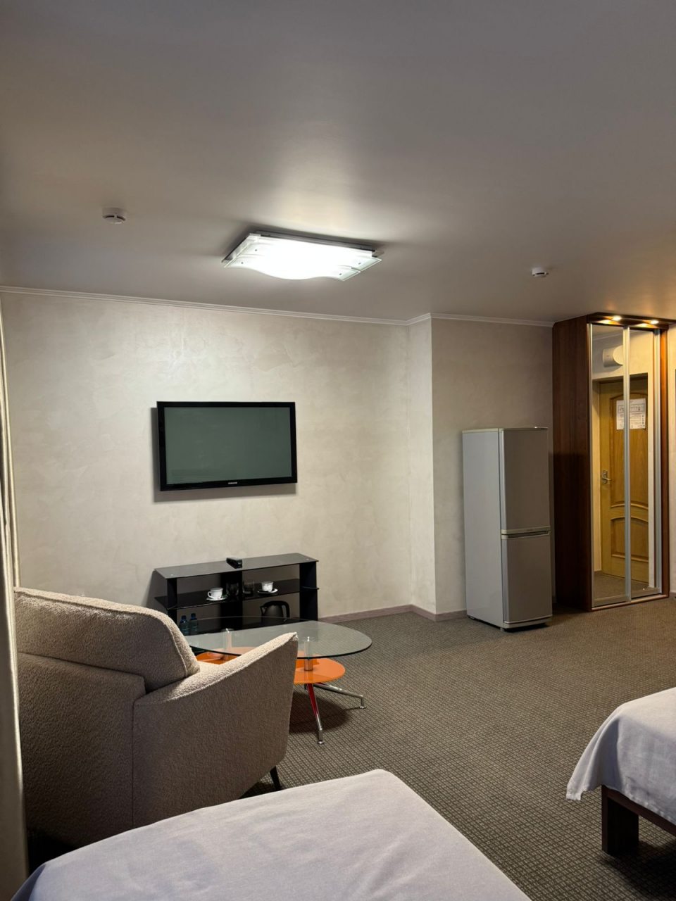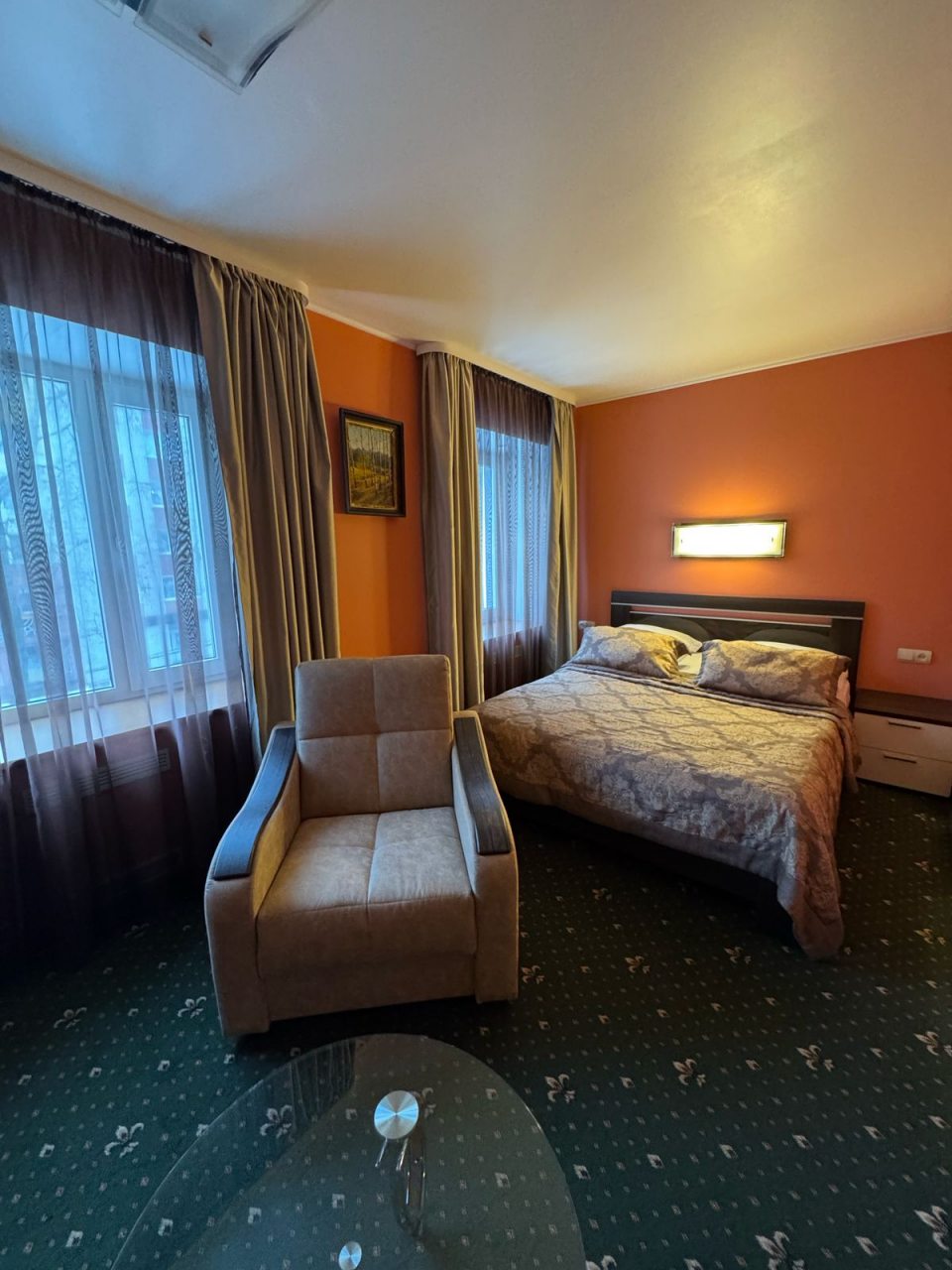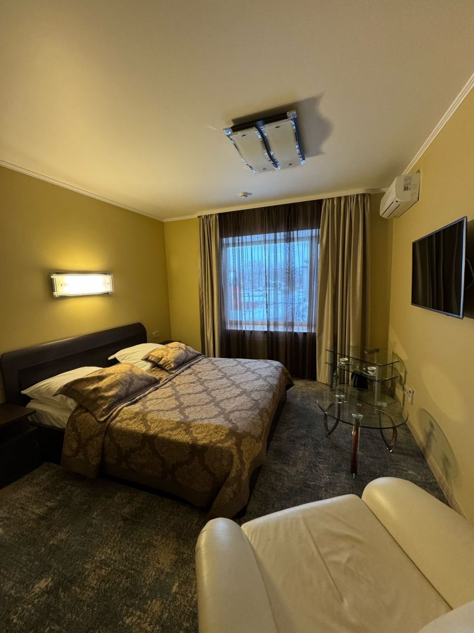 Понравилось нам всё.Чистота,порядок в номере.Удобная кровать, шикарное кресло,белоснежное бельё,полотенца.Есть в номере холодильник,чайник,чай,сахар.