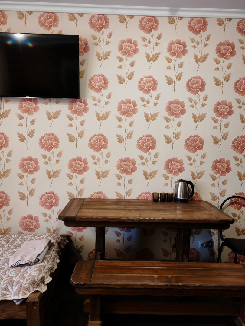В номере есть стол, чайник и чашки, телевизор.