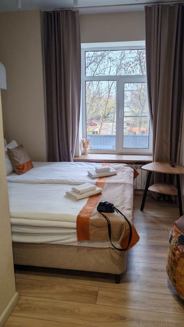 Отель находится в пяти минутах от ЖД вокзала. Но до центра надо ехать, автобусы ходят хорошо. Ездила и туда и обратно. Сам отель-мини. Находится на 2м этаже 2х этажного дома. Номер маленький, но в него уместили даже кухонный уголок с посудой, чайником и микроволновой, холодильником.Но тумбочка прикроватная не вошла. Сан узел не маленький, все необходимое есть. Звукоизоляция неплохая. Приехала чуть раньше, сразу заселили.