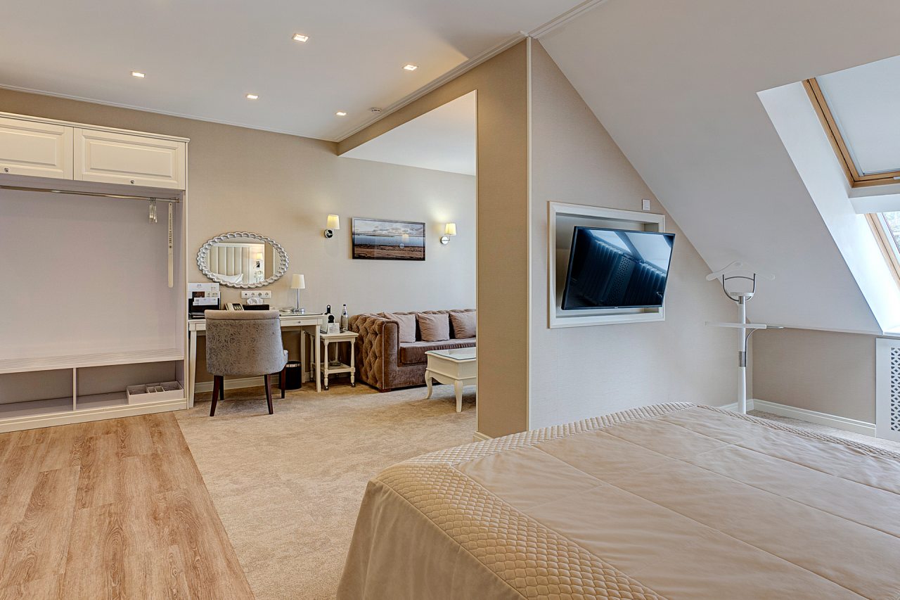 Отличный номер стандарт, удобные шкафы, в шкафу и сейф, и бар для желающих, и электрочайник для кофе или чая. Есть диванчик. Но кресло как рабочее у письменного стола низковато.