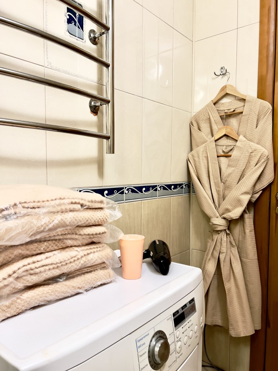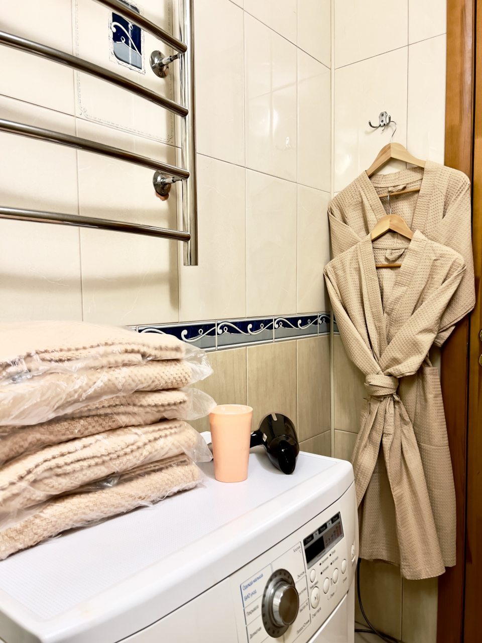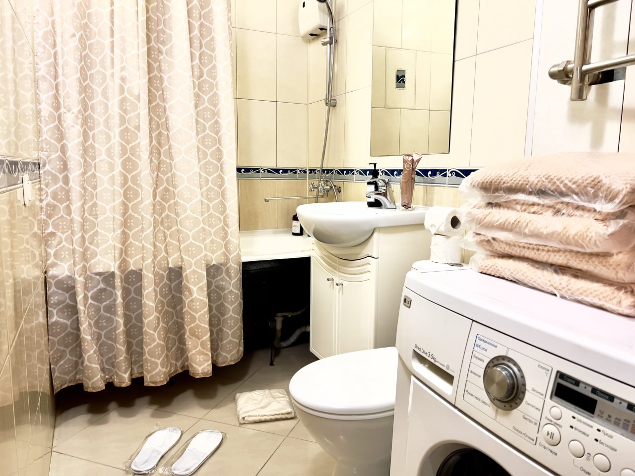 Брали квартиру из расчета на 4-х. По сути, это однушка, переделанная в двушку, где в одной комнате и гостиная, и кухонный уголок. Вот в нем не мешало бы обновить плиту и СВЧ. Оно, конечно, работает, но выглядит не ново. Постельное чистое, в нужном количестве, чтоб и на диван постелить. Полотенца новые.