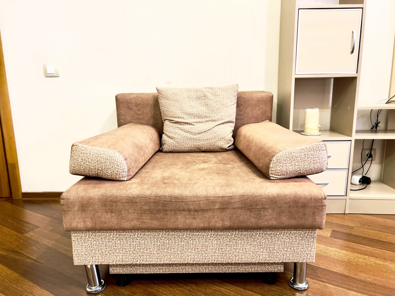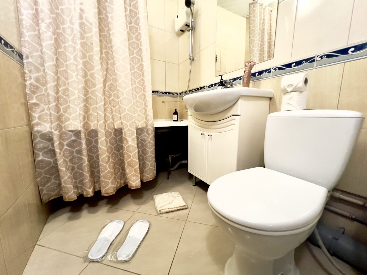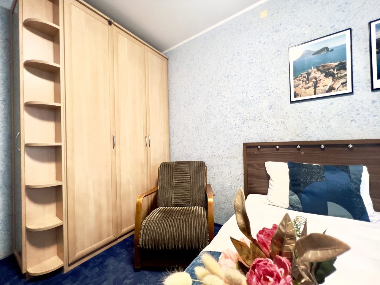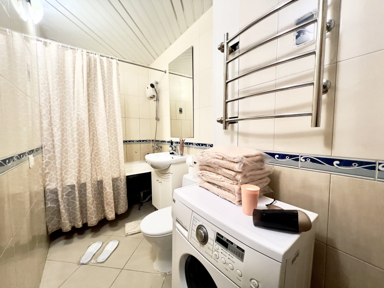 Брали квартиру из расчета на 4-х. По сути, это однушка, переделанная в двушку, где в одной комнате и гостиная, и кухонный уголок. Вот в нем не мешало бы обновить плиту и СВЧ. Оно, конечно, работает, но выглядит не ново. Постельное чистое, в нужном количестве, чтоб и на диван постелить. Полотенца новые.