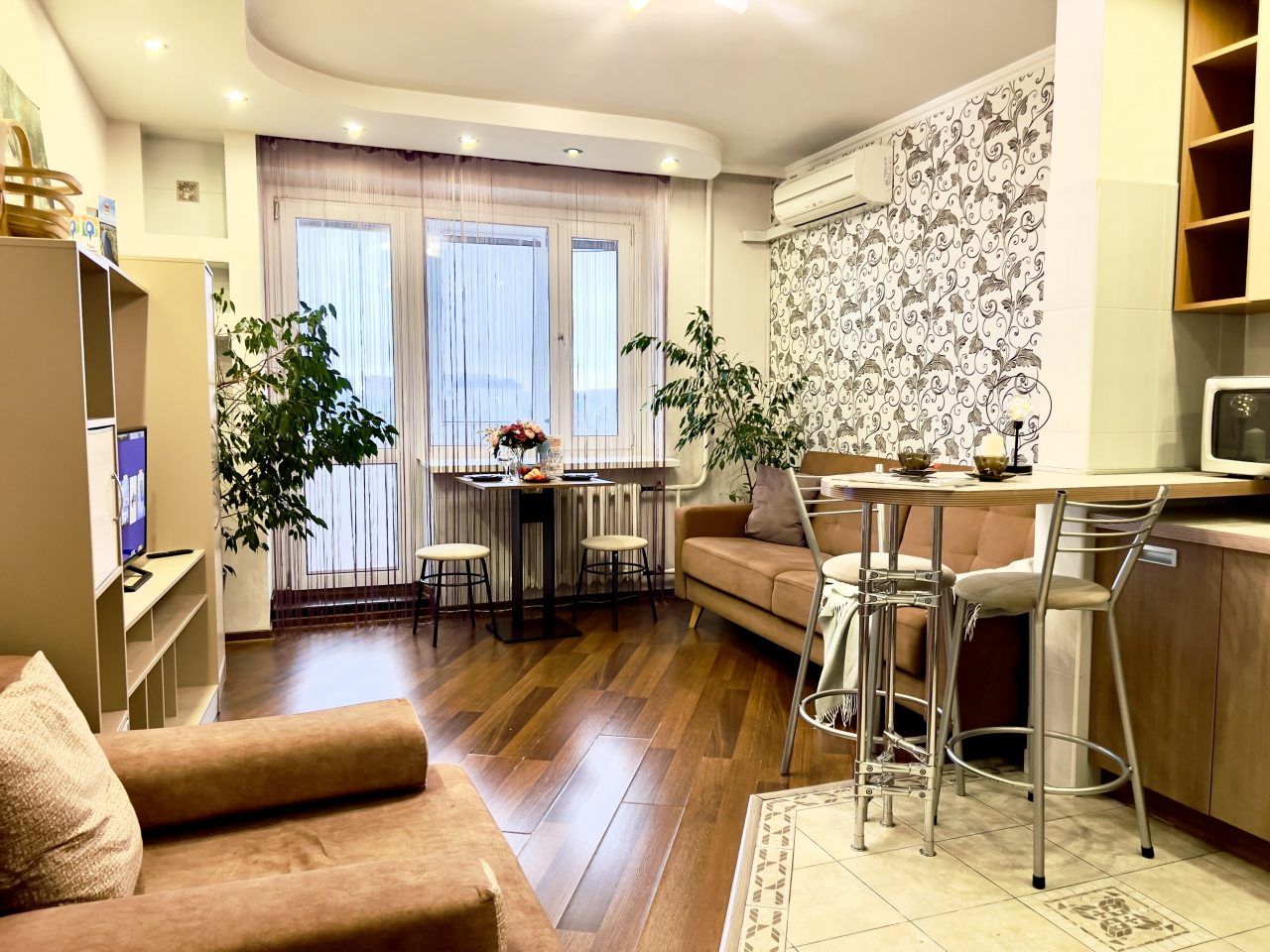 Приехали на свадьбу друзей и остановились на это время в апартаментах. Квартире при въезде была идеально чистая. Вся мебель и техника в отличном состоянии. Отличное расположение, все необходимое в шаговой доступности.