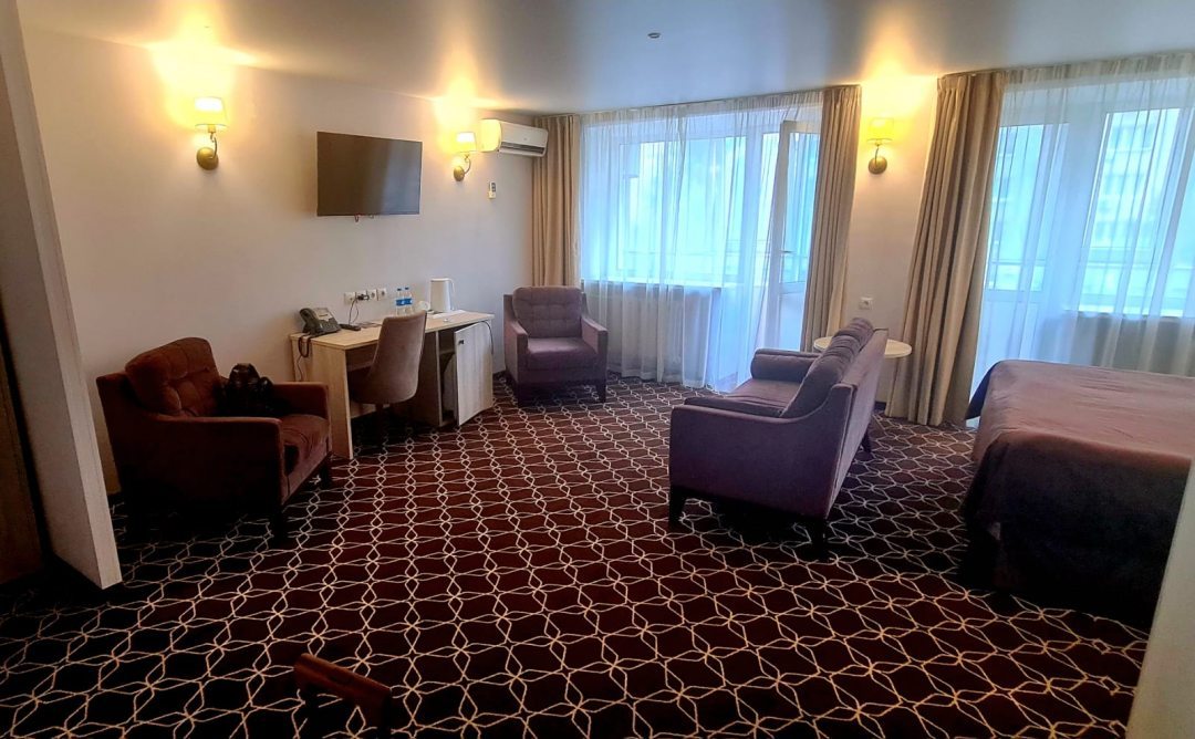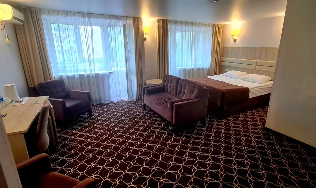 Не далеко от центра и ЖД вокзала. Гостиница еще советских времён, но с очень приличной реновацией. Просторный сьют, 2 балкона (на которых курить, правда нельзя, если они выходят на Бестужева). Отличные матрас и постельное бельё. Высыпался. В санузле все необходимые мыльно-рыльные. Очень приличный завтрак с мясом и свежими арбузами.