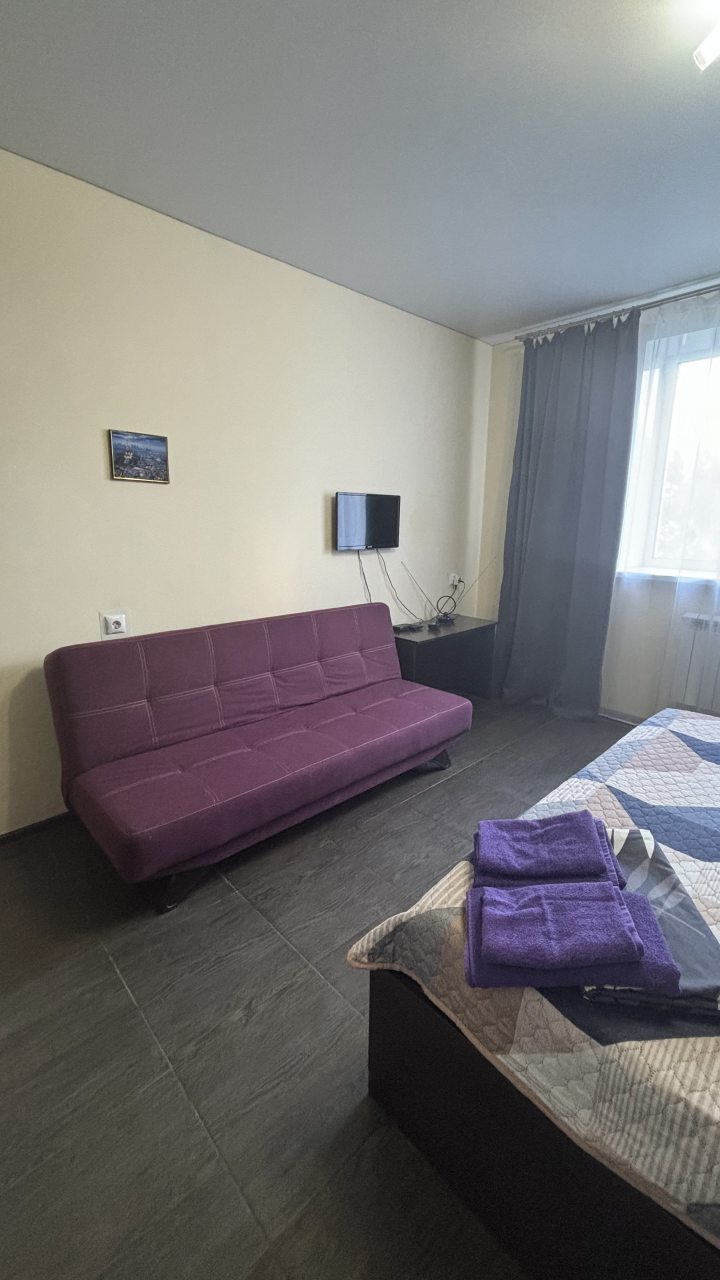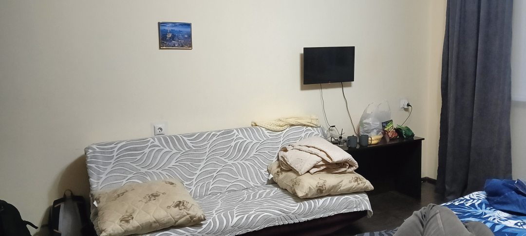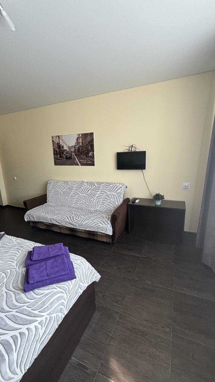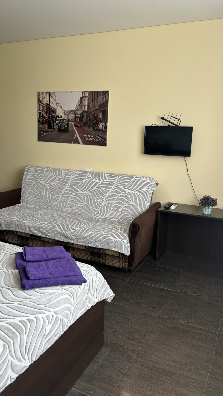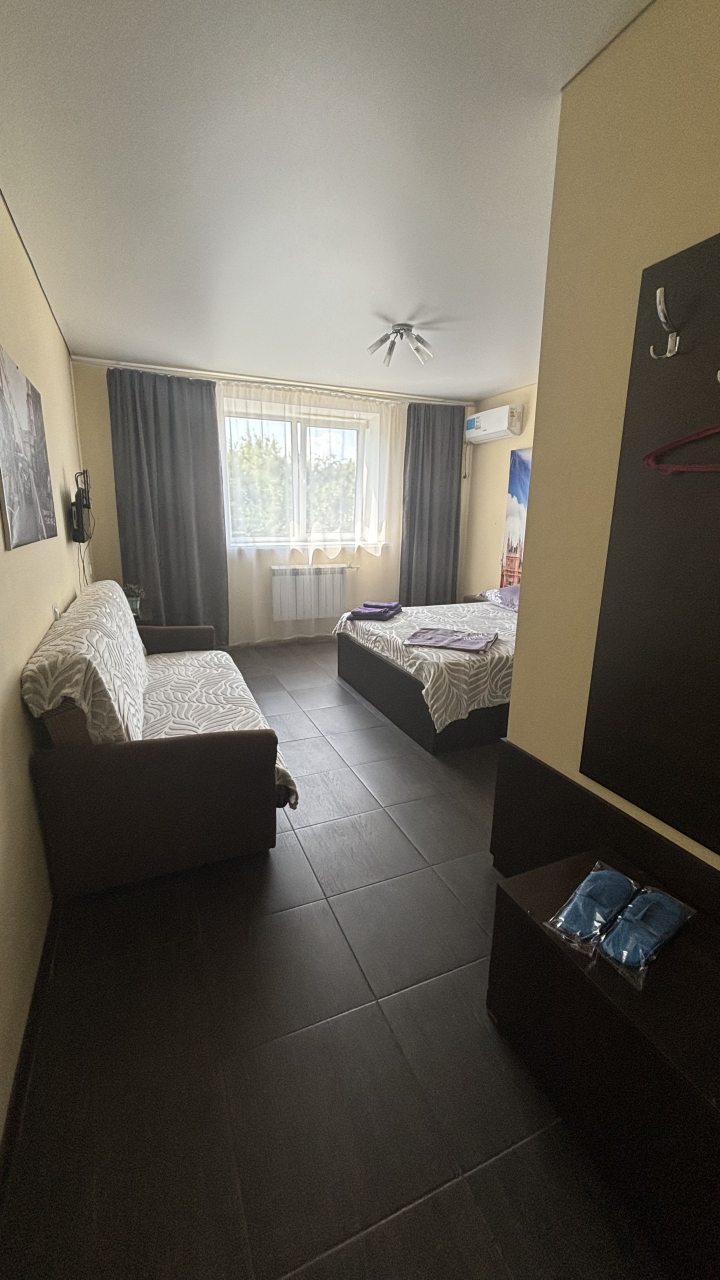 Прекрасная гостиница. Чистое бельё, хороший санузел, горячая вода. Выдают шампунь, гель дд, полотенце, тапочки. Есть кухня с посудой, чайником и тд., просторный номер с дополнительным диваном, удобная кровать. Местоположение гостиницы в тихом районе даёт возможность выспаться. Есть место для машины.