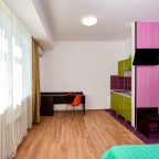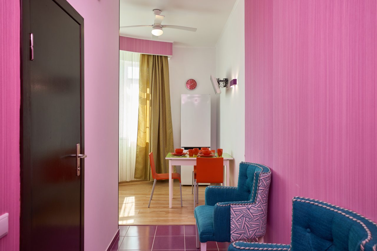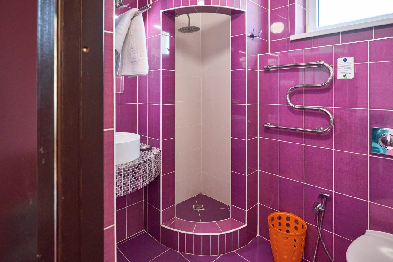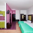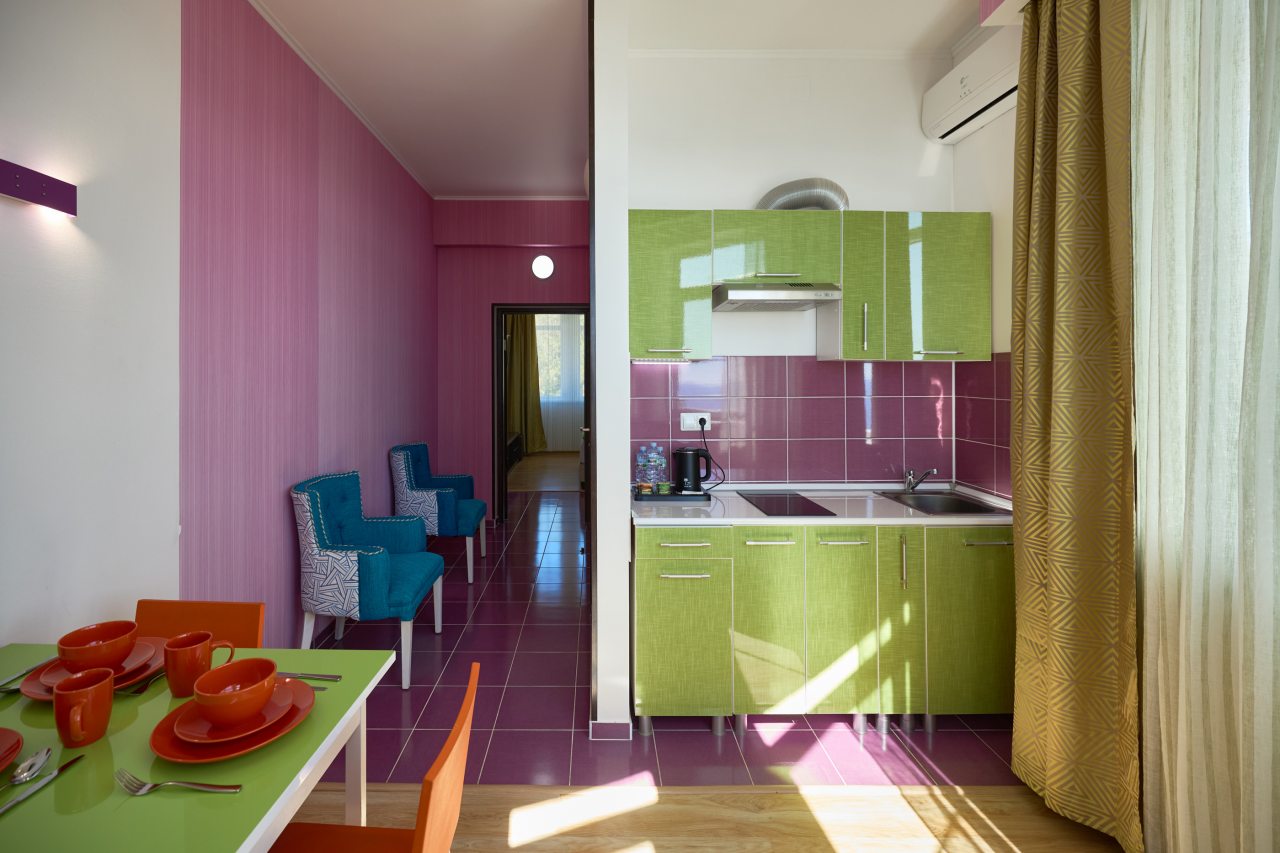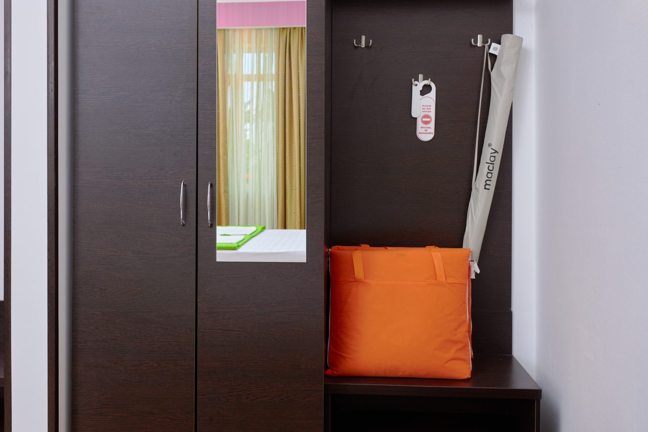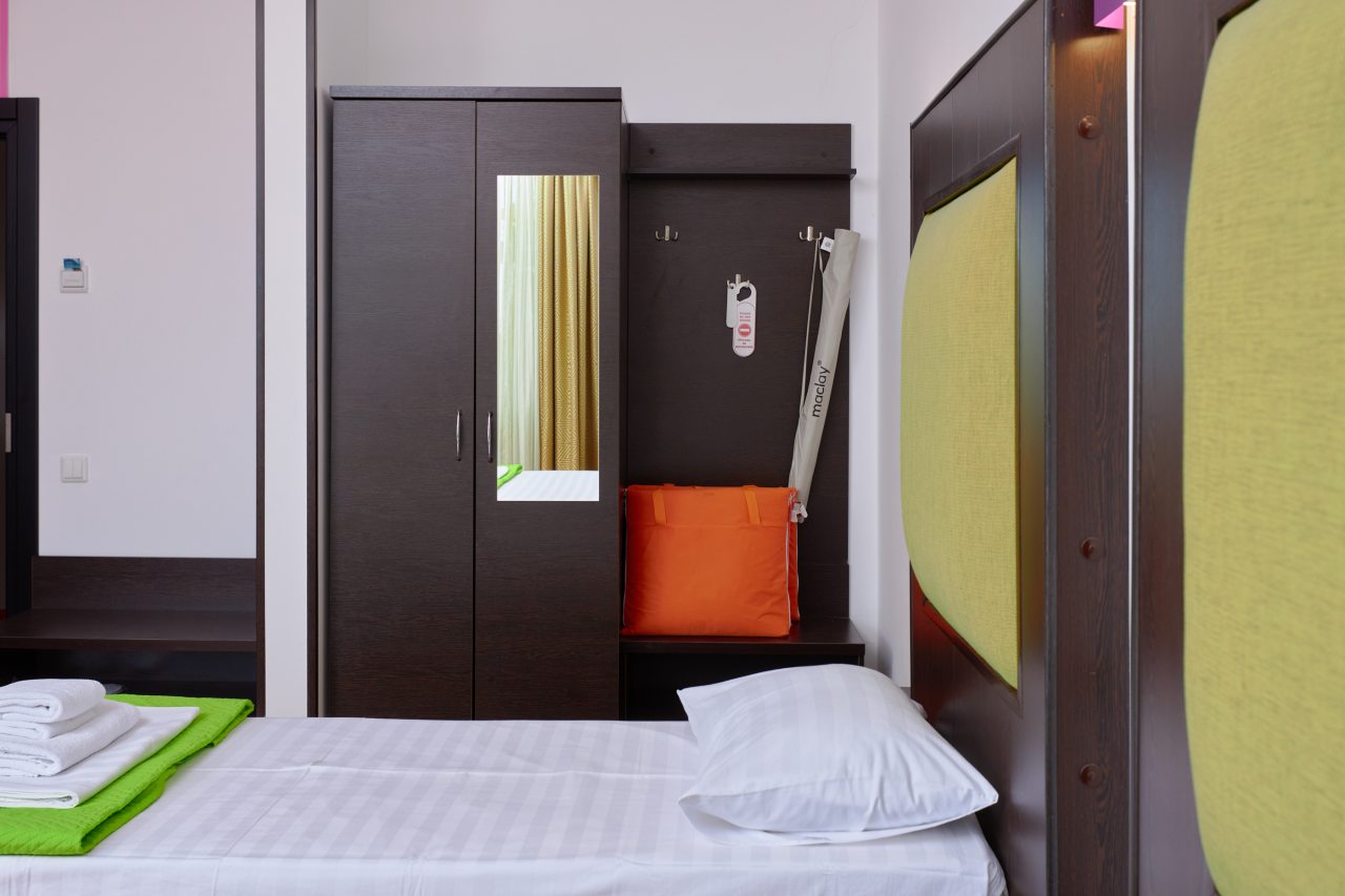 Бронировал одноместный номер в очень красочном отеле. Номер довольно интересный. Приятные глазу цвета в интерьере присутствуют. Спальное место и кухонная зона в одной комнате. Ванная комната хороша, из душа идет сразу теплая вода с отличным напором.