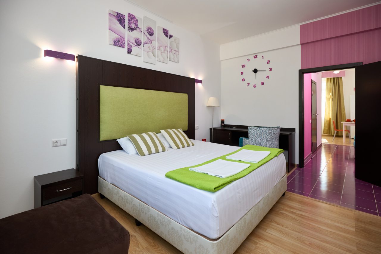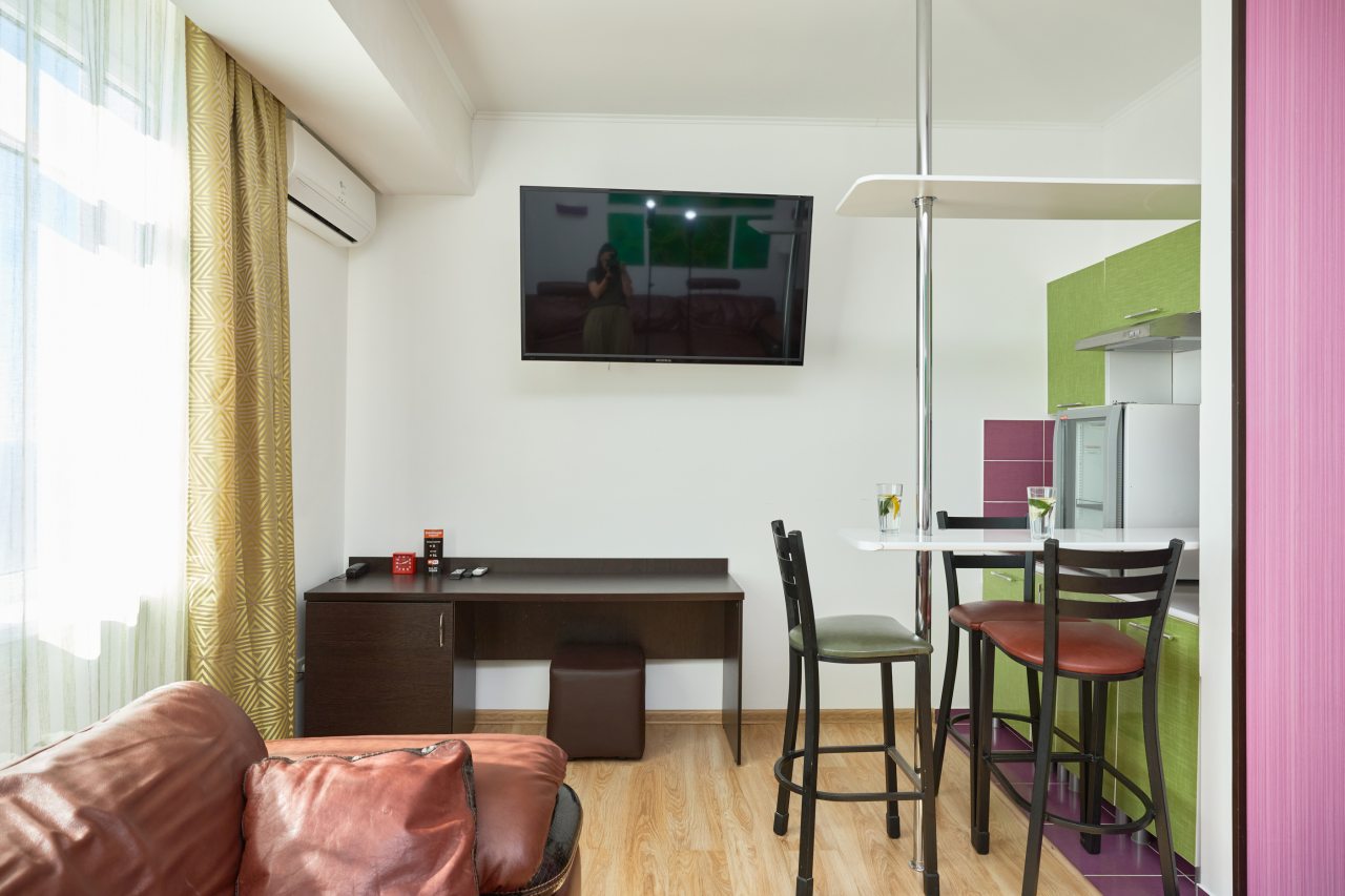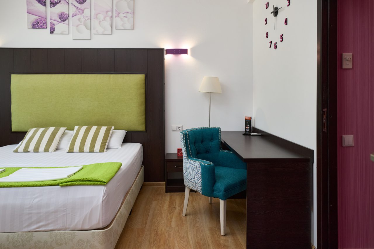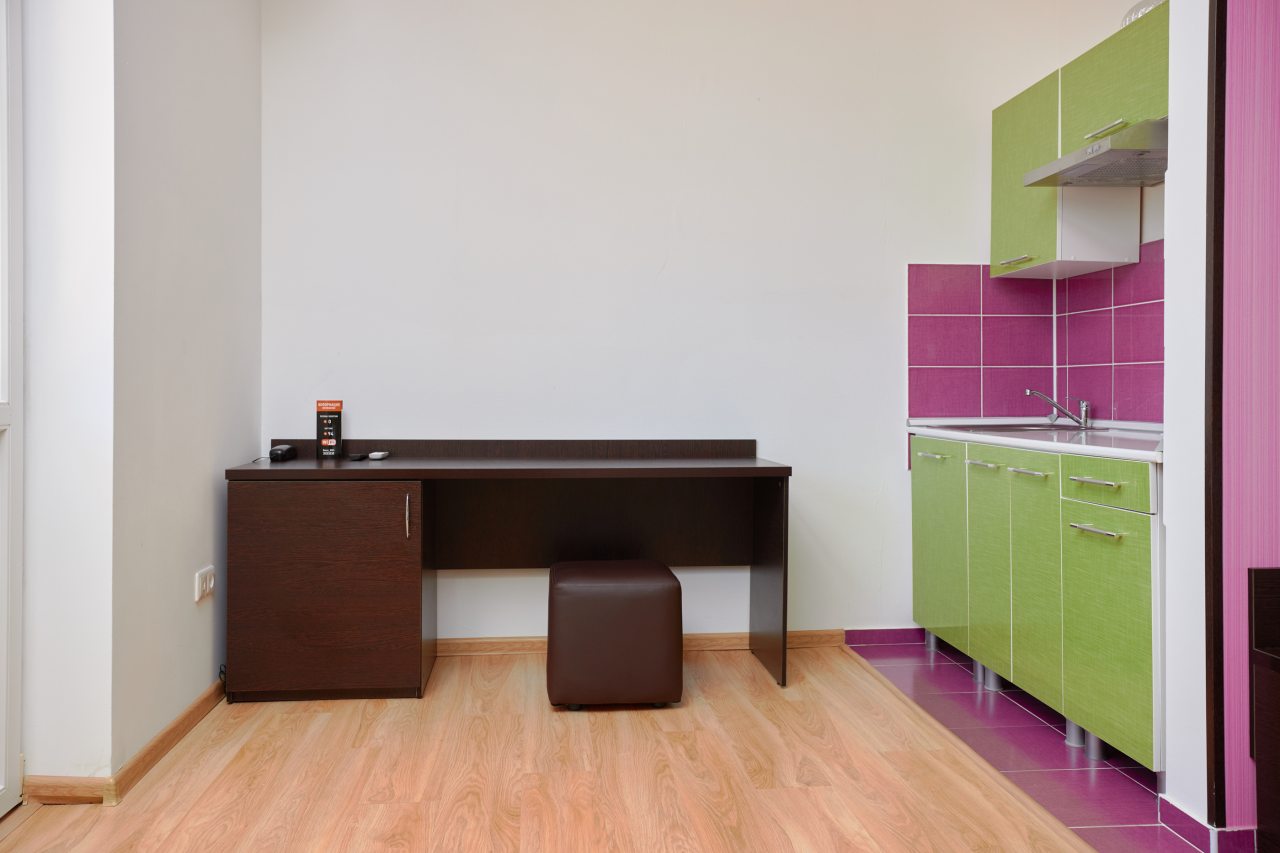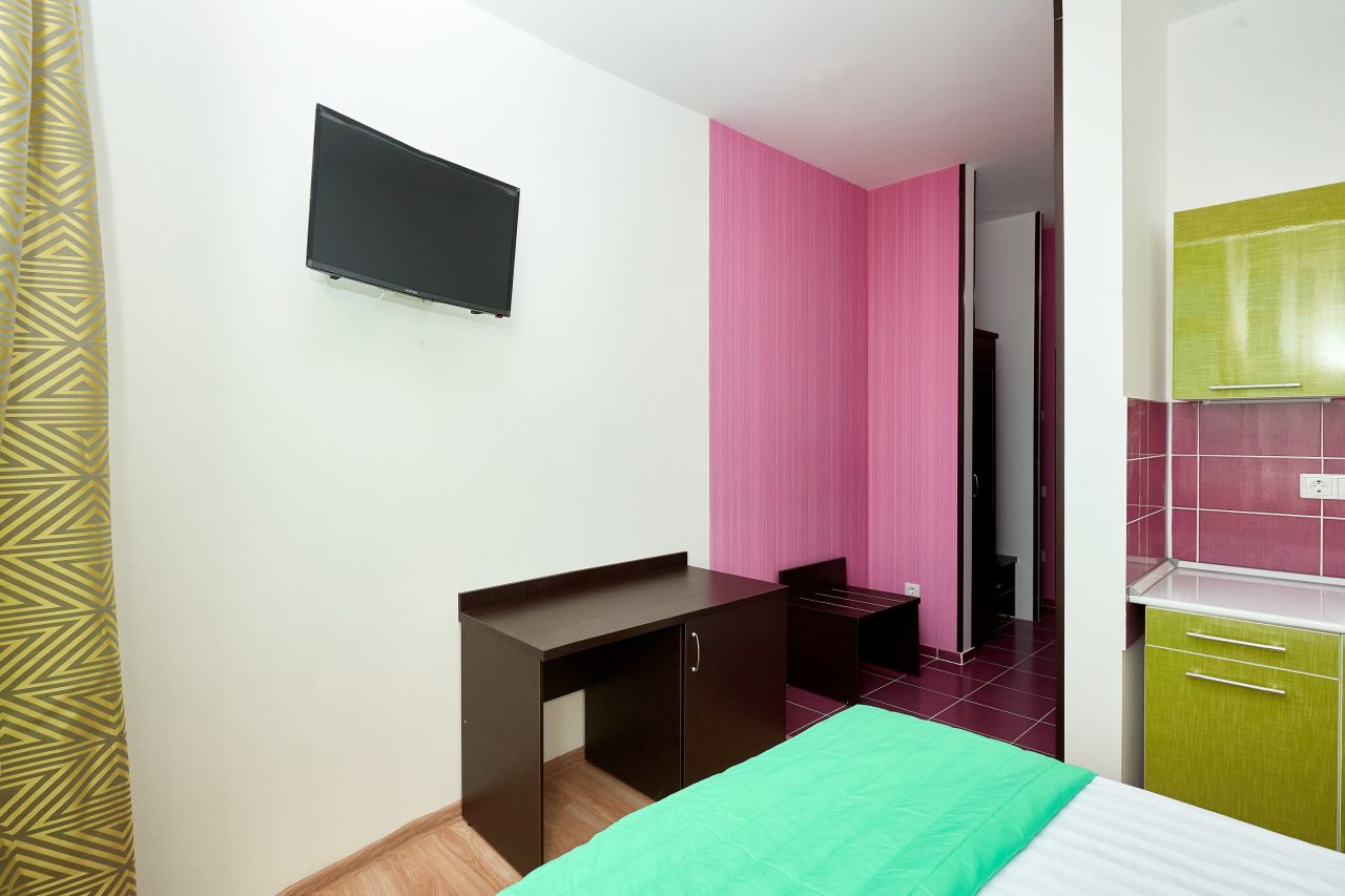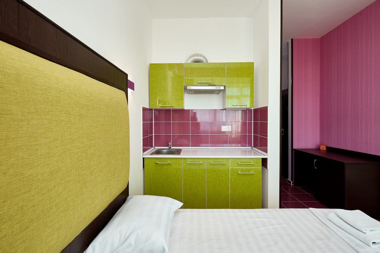 Бронировал одноместный номер в очень красочном отеле. Номер довольно интересный. Приятные глазу цвета в интерьере присутствуют. Спальное место и кухонная зона в одной комнате. Ванная комната хороша, из душа идет сразу теплая вода с отличным напором.