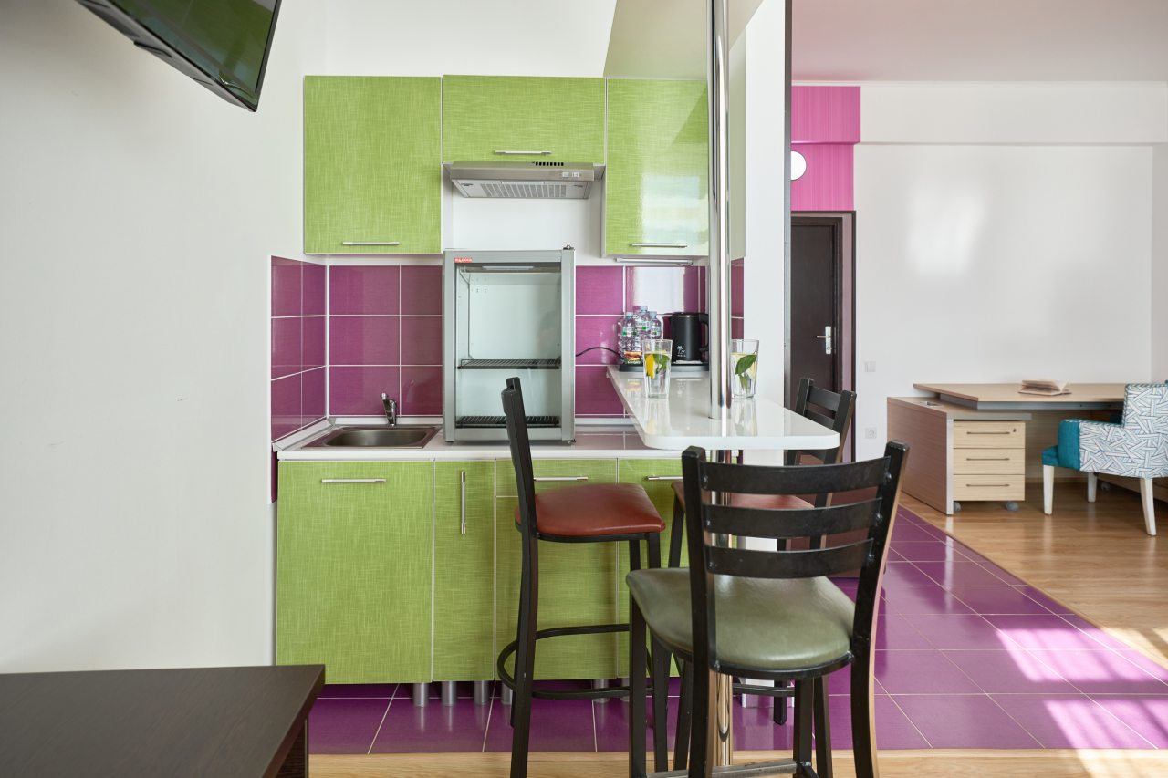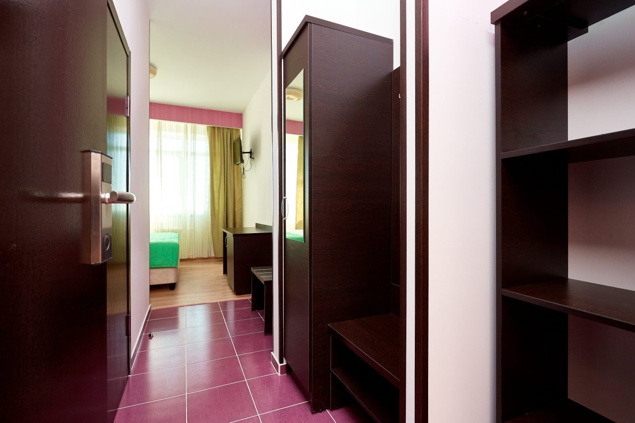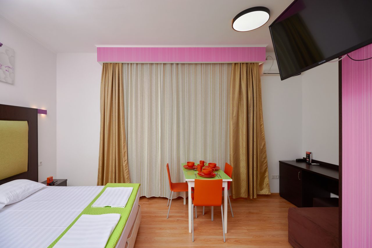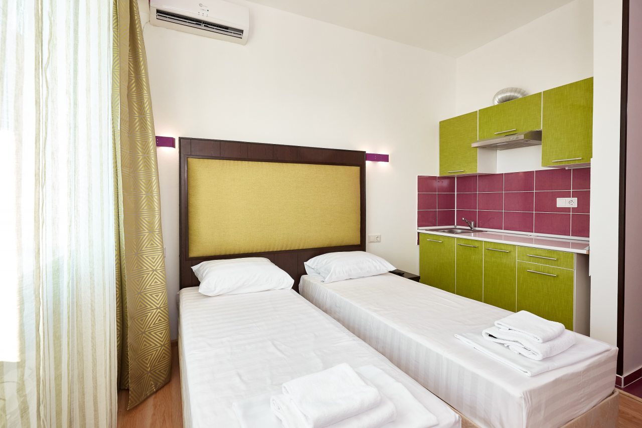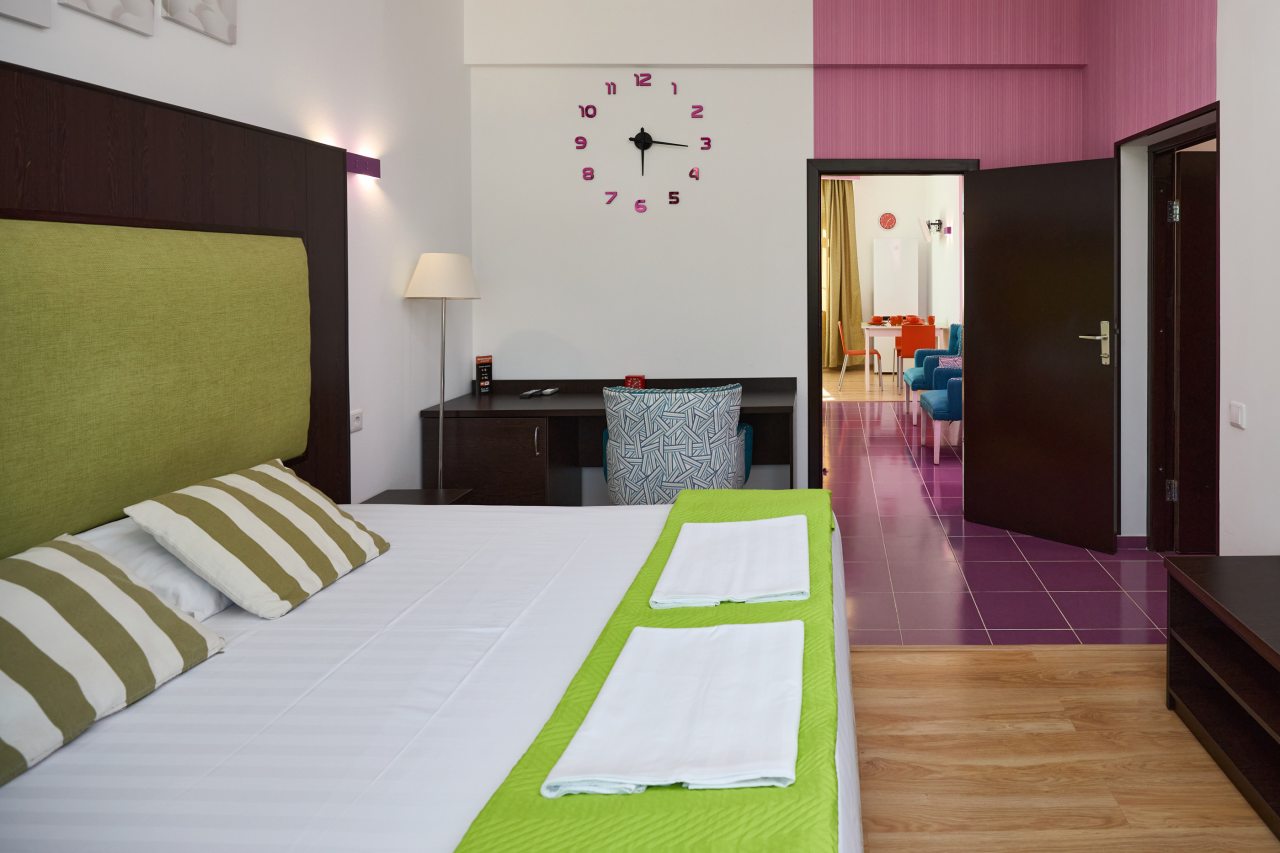 Бронировал одноместный номер в очень красочном отеле. Номер довольно интересный. Приятные глазу цвета в интерьере присутствуют. Спальное место и кухонная зона в одной комнате. Ванная комната хороша, из душа идет сразу теплая вода с отличным напором.