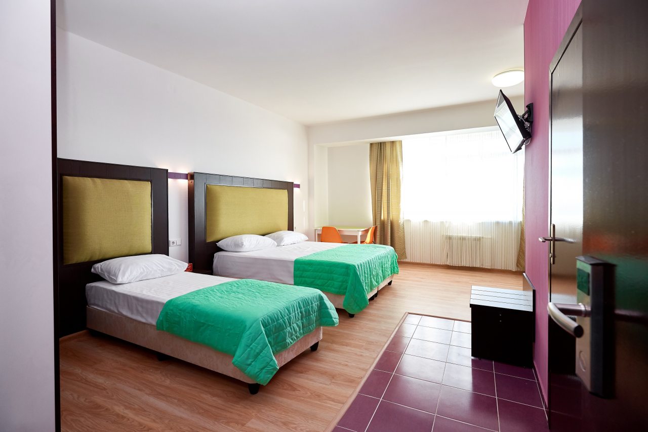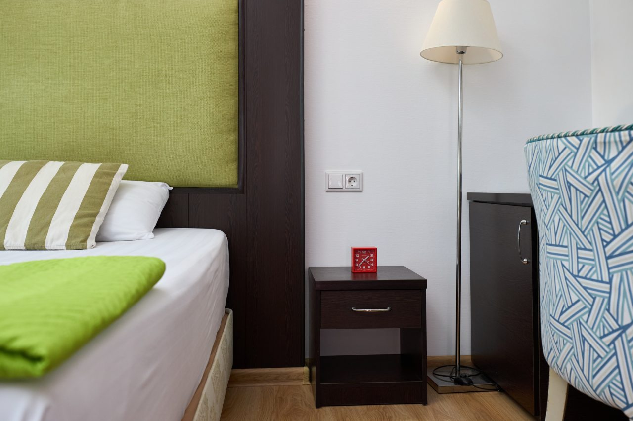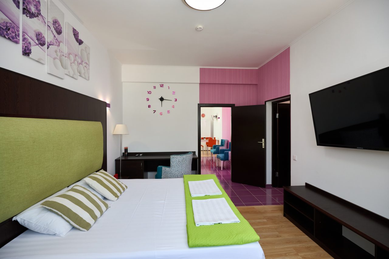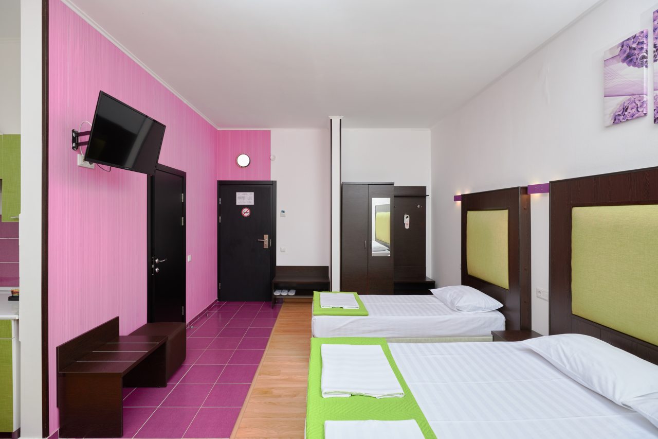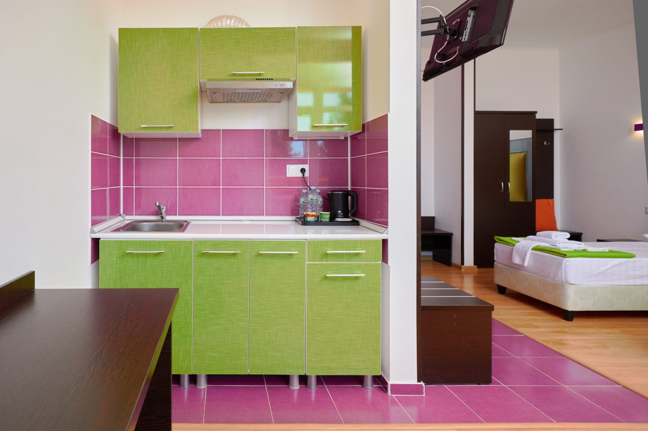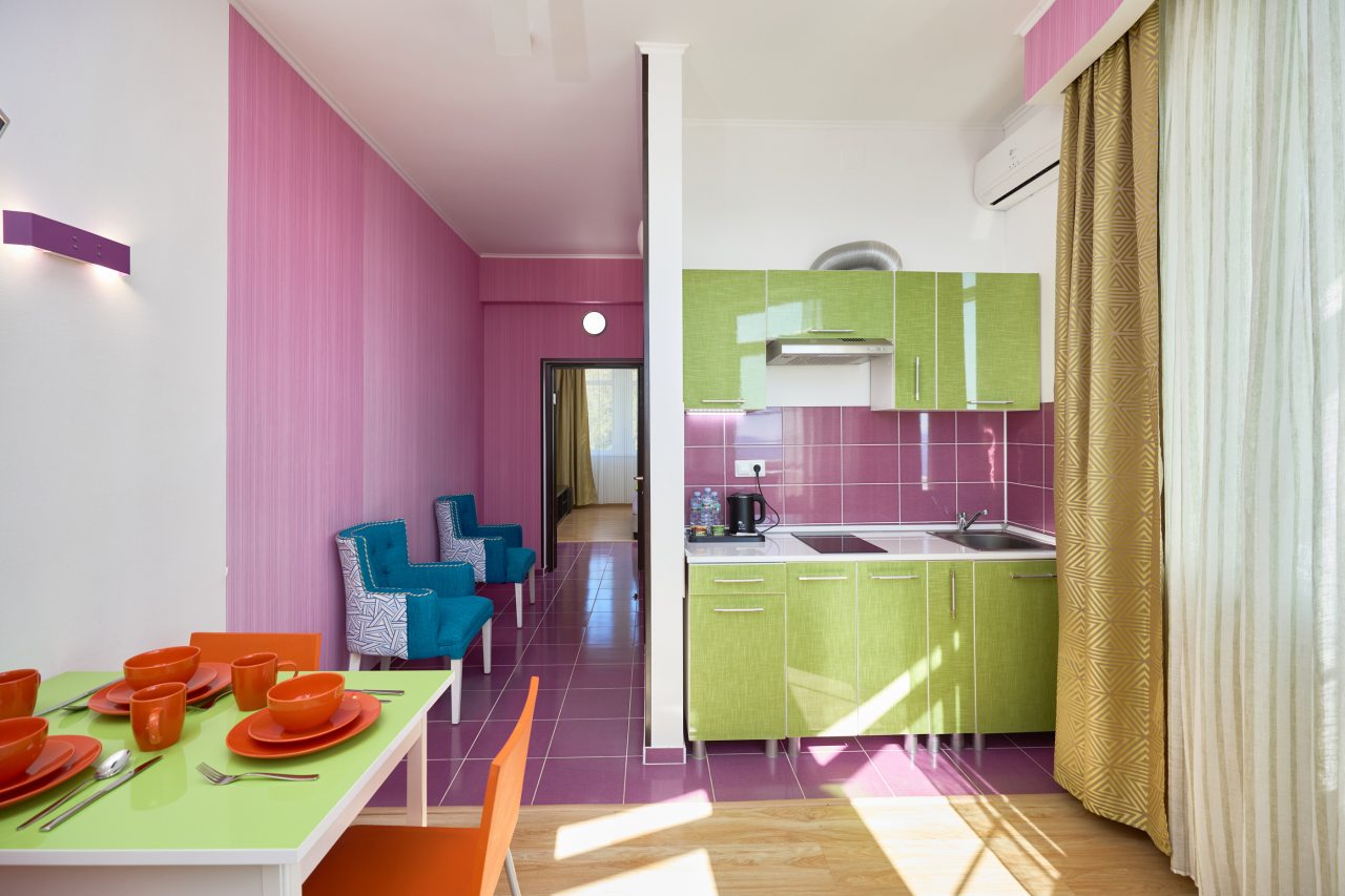 Бронировал одноместный номер в очень красочном отеле. Номер довольно интересный. Приятные глазу цвета в интерьере присутствуют. Спальное место и кухонная зона в одной комнате. Ванная комната хороша, из душа идет сразу теплая вода с отличным напором.