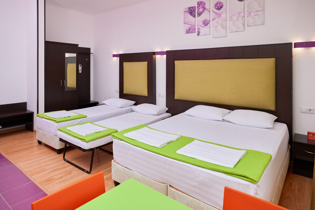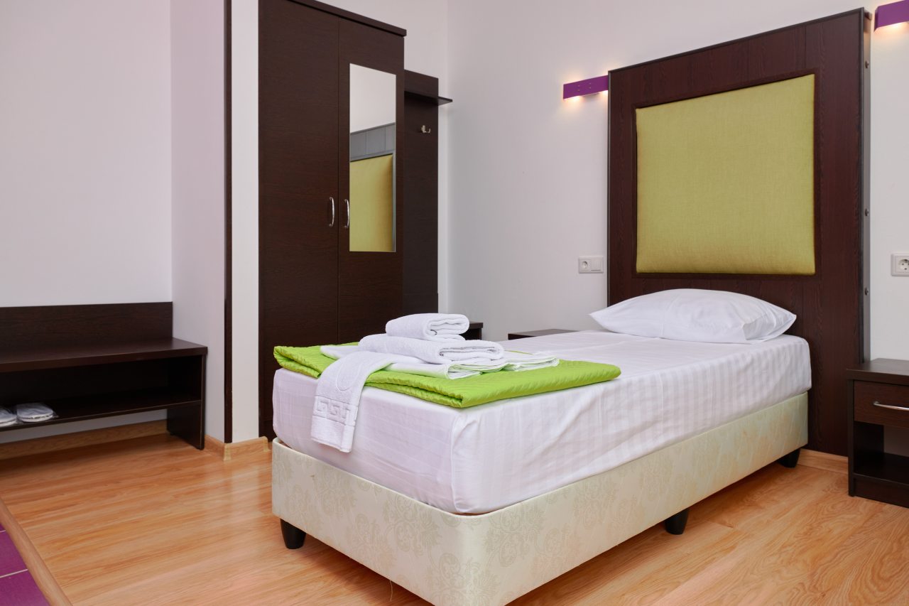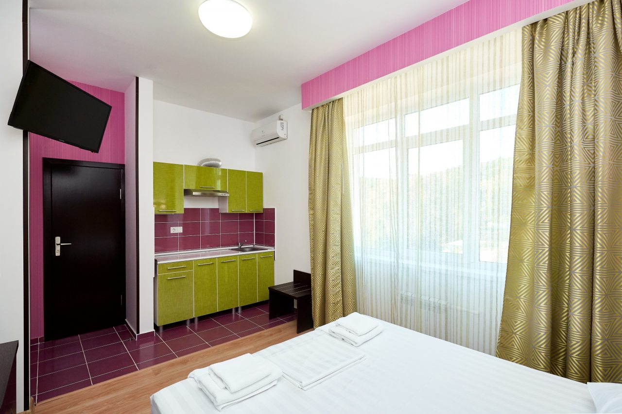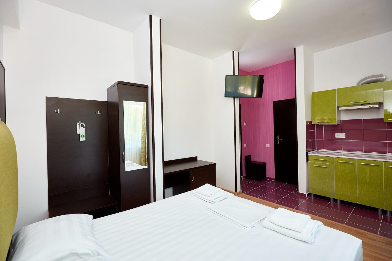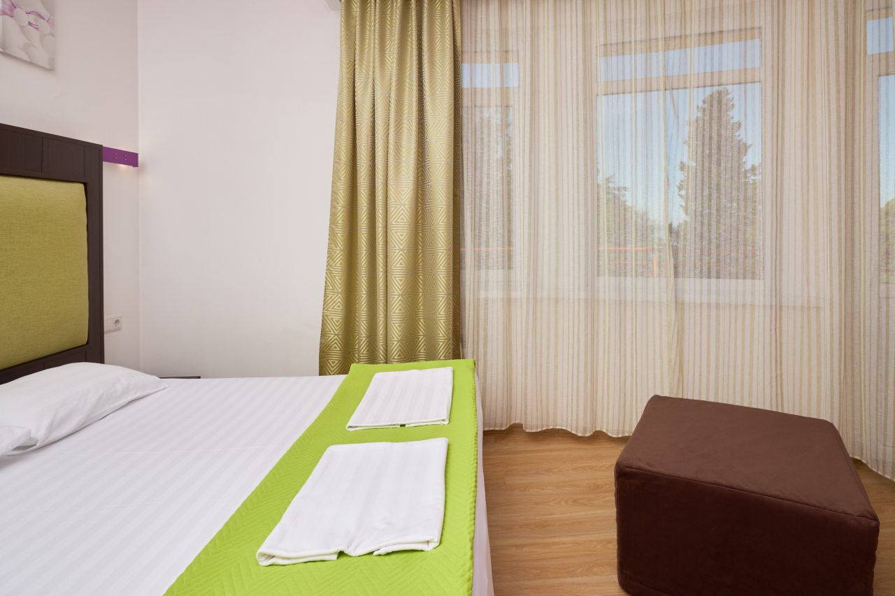 Мы занимали двухместный номер делюкс, оснащенный своим балконом. Не пожалели ни разу, что выбрали именно этот вариант. Каждое утро я выходила на балкон и любовалась рассветом! Внутри нашего номера была установлена собственная ванна и туалет, совмещенные в одном санузле. Также имелась и собственная кухня. Кровать большая, шкаф удобный. Отдыхалось с комфортом!