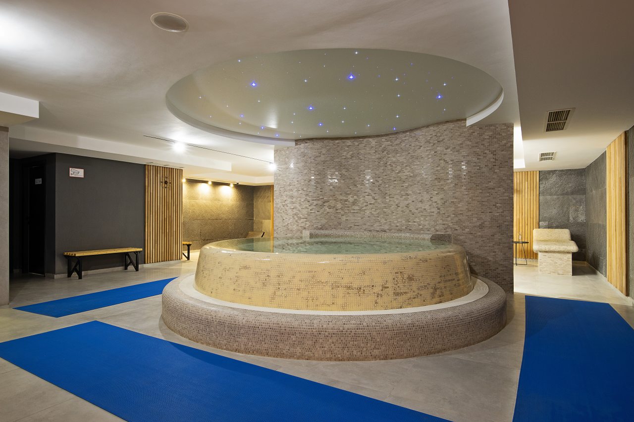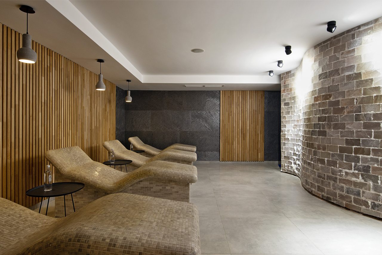 Термальная зона небольшая: 2 сауны, джакузи и теплые лежаки с солевой стеной.