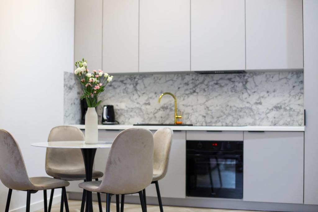 В современных дизайнерских апартаментах имеются гостиная и обеденная зоны, а также кухня с холодильником и духовкой.