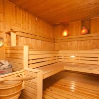Фитнес-центр оборудован тренажерным залом, сауной и зоной отдыха.