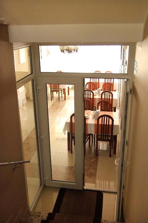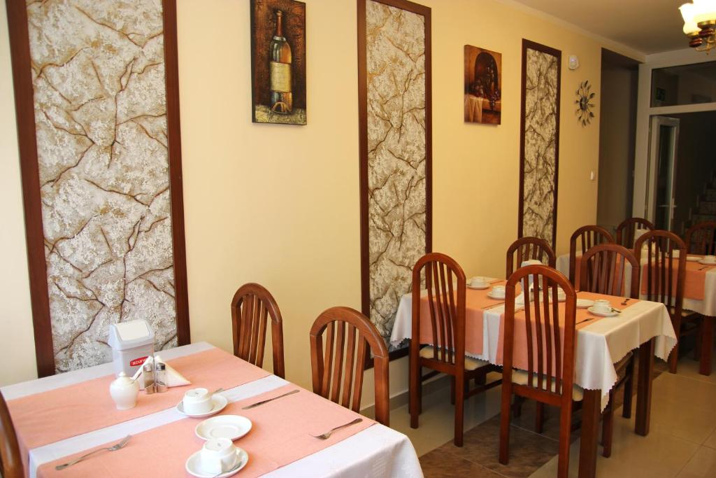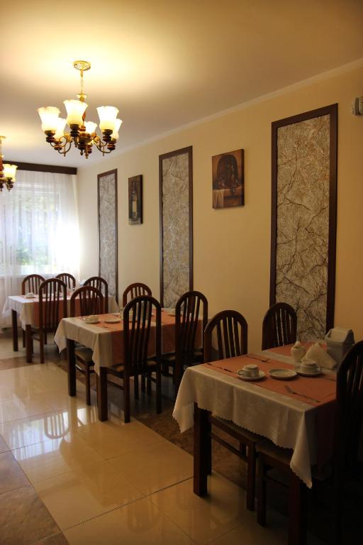 В столовой отеля Willa Preludium, оборудованной деревянными столами и стульями, сервируется завтрак.