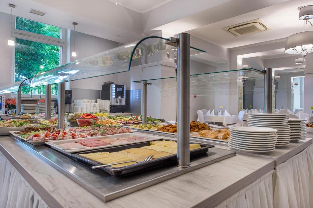 В жилом здании отеля работает фирменный ресторан домашней польской кухни с открытой террасой в саду, где накрывают блюда в летний сезон.