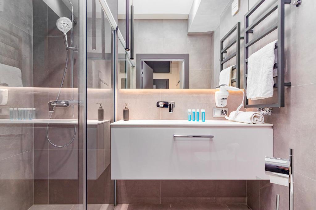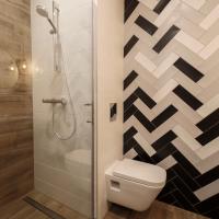 Собственная ванная комната каждых апартаментов укомплектована бесплатными туалетно-косметическими принадлежностями.