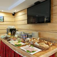Завтрак «шведский стол» накрывают в просторной столовой с телевизорами и обоями с горным пейзажем.