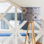 Апартаменты и номера-студио с деревянным полом элегантно оформлены в бело-синих тонах.