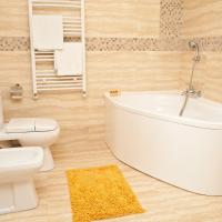 Собственные ванные комнаты с душем или ванной, феном и тапочками отделаны кафельной плиткой.