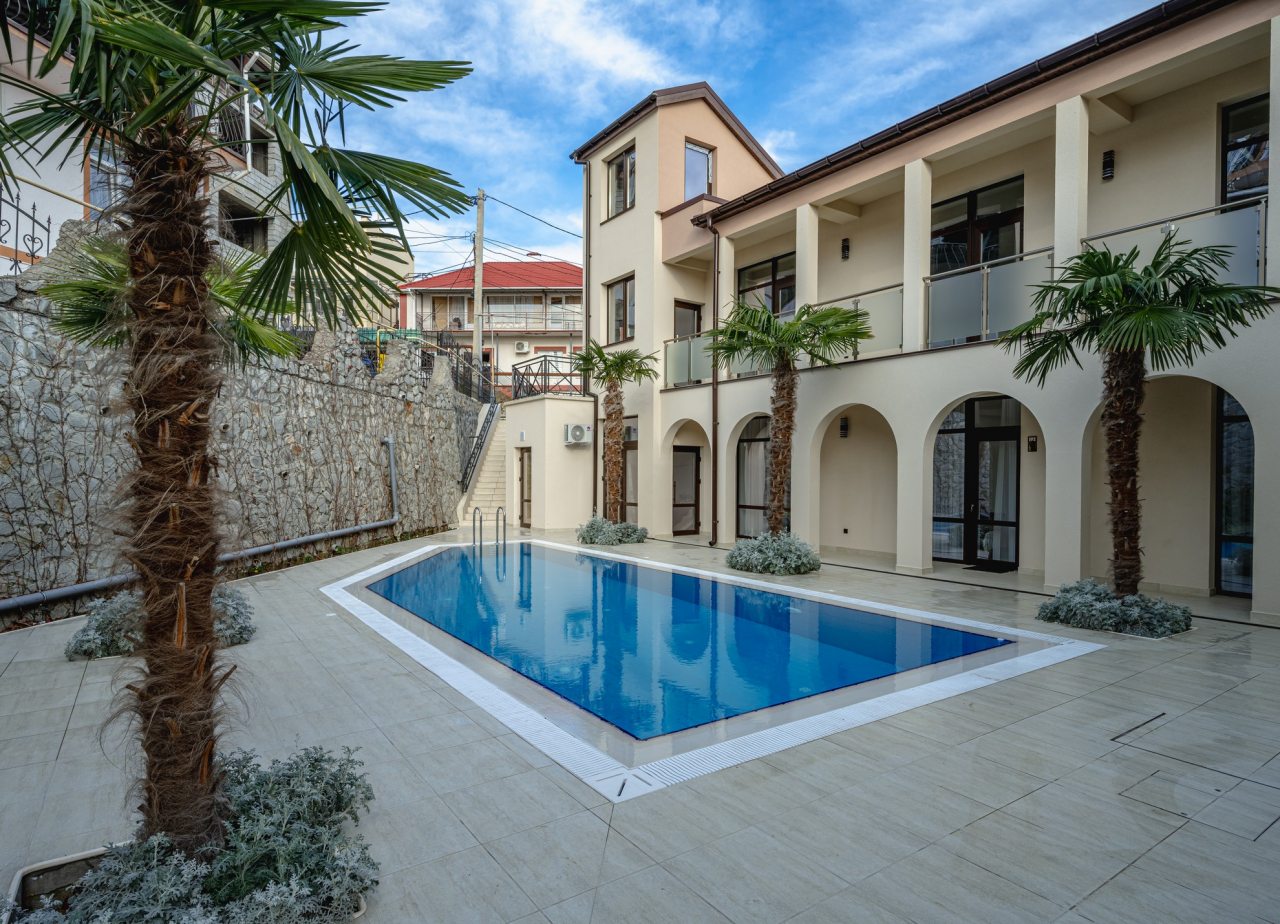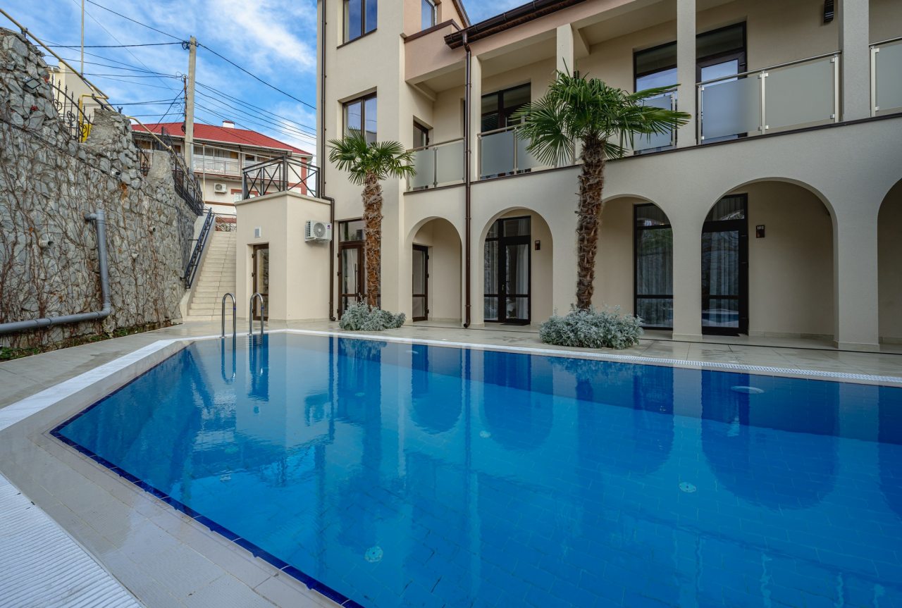 Мисхор, Алупкинское ш., д. 56-а посмотреть картуДо Мисхор 1.7 кмДо аэропорта 50.1 кмДо Ж/Д вокзала 41.6 кмДо пляжа 176 мДо Черного моря 300 м (вид на море)- Бассейн